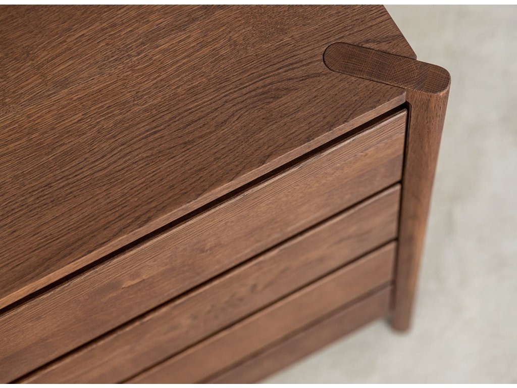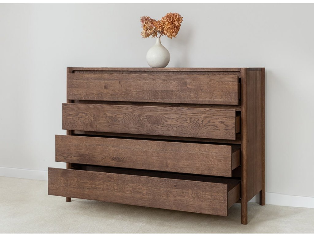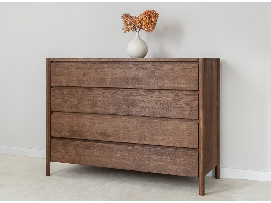 Masívna dubová komoda z kolekcie Campi v prevedení tabakovo hnedá zaujme čistým minimalistickým dizajnom s frézovanými čelami bez úchytiek a precíznym spracovaním. Je vyrobená z prírodného dubového dreva s olejovanou polomatnou povrchovou úpravou, ktorá zvýrazňuje kresbu dreva a dodáva mu elegantný, hlbší odtieň. Komoda ponúka 4 priestranné zásuvky s kvalitným pojazdom Hettich s tlmeným dovieraním pre maximálny komfort používania. Ideálna voľba pre moderné aj nadčasové interiéry.