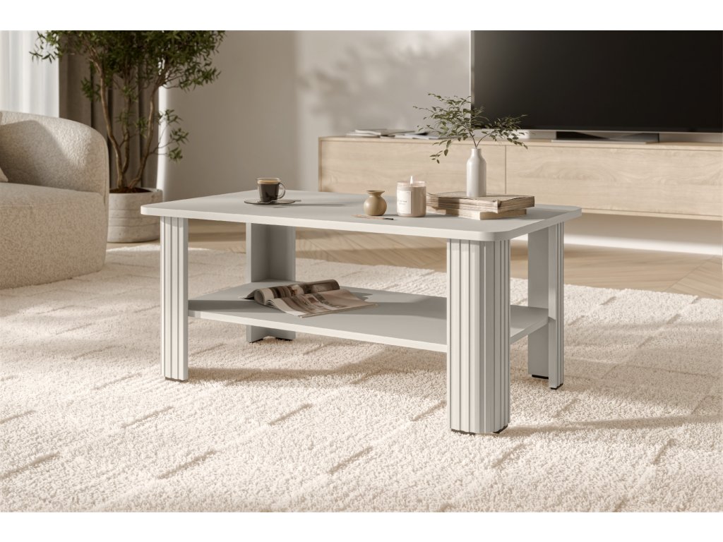 Rozměry 96 × 55 × 42 cm nabízí dostatek prostoru pro odkládání knih, časopisů či dekorací. Praktická úložná police udrží vše potřebné na dosah ruky, zatímco dekorativní lišty na nohou dodávají stolku jemný, elegantní akcent.
