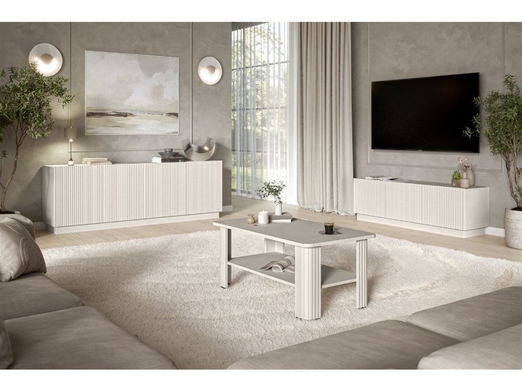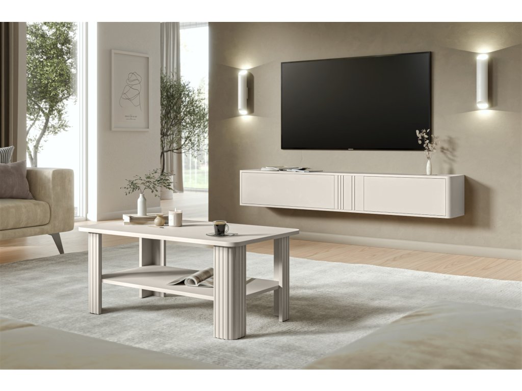 Konferenční stolek Rest v elegantním kašmírově béžovém odstínu představuje harmonické spojení stylu a praktičnosti. S rozměry 96×55×42 cm nabízí dostatek místa pro dekorace, knihy či drobnosti každodenního života. Stolek doplňuje praktická úložná police a dekorativní lišty na nohou, které mu dodávají jemný a sofistikovaný vzhled