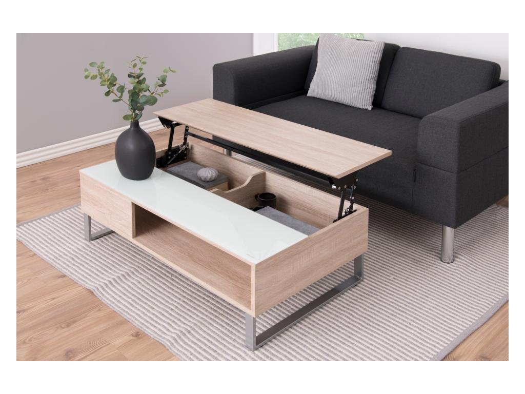 Díky zvedacímu mechanismu se stolek mění z designového kousku na praktický úložný prostor – ideální pro odložení ovladačů, časopisů nebo jiných drobností. Otevřená přihrádka navíc poskytuje snadno dostupné místo na předměty, které chcete mít stále po ruce.