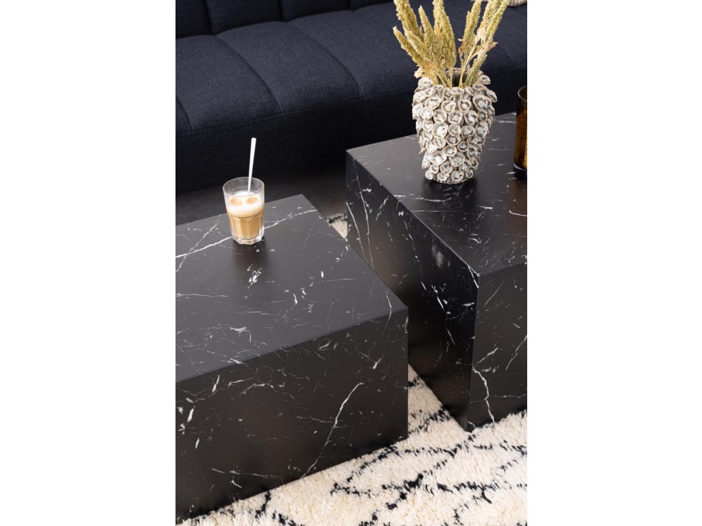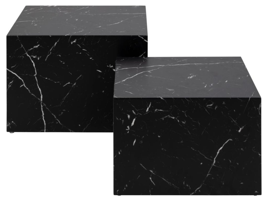 Sada konferenčních stolků Dice z černého mramoru Marquina v hranatém designu je moderním doplňkem každého interiéru. Elegantní čtvercový tvar a kvalitní materiály z MDF imitují luxusní kámen. Sada obsahuje dva stolky různých výšek pro praktické využití. Skvěle se hodí do obývacího pokoje nebo k sedací soupravě.