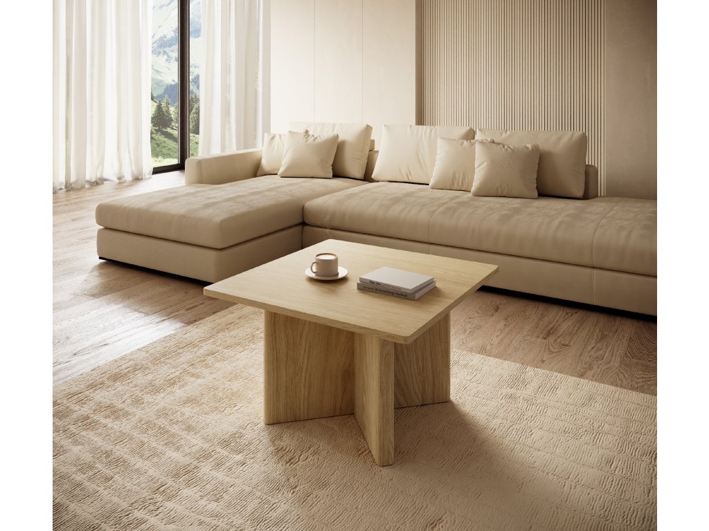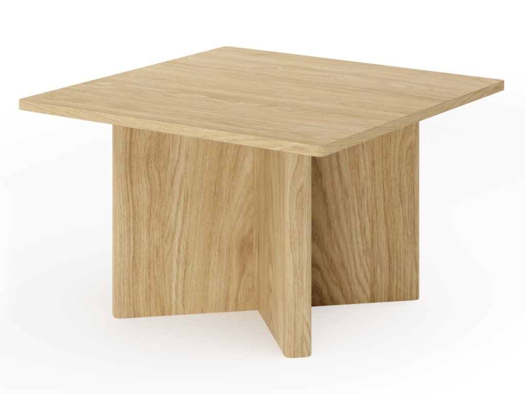 Konferenčný stolík s netradične riešenou podnožou v tvare dvoch prekrížených dosiek, na ktorej je uložená štvorcová horná doska so zaoblenými rohmi. Vyhotovený je v dekore dub olejovaný, ktorý pôsobí prirodzene a nadčasovo. Stabilná konštrukcia zabezpečuje pevnosť a komfort pri používaní.