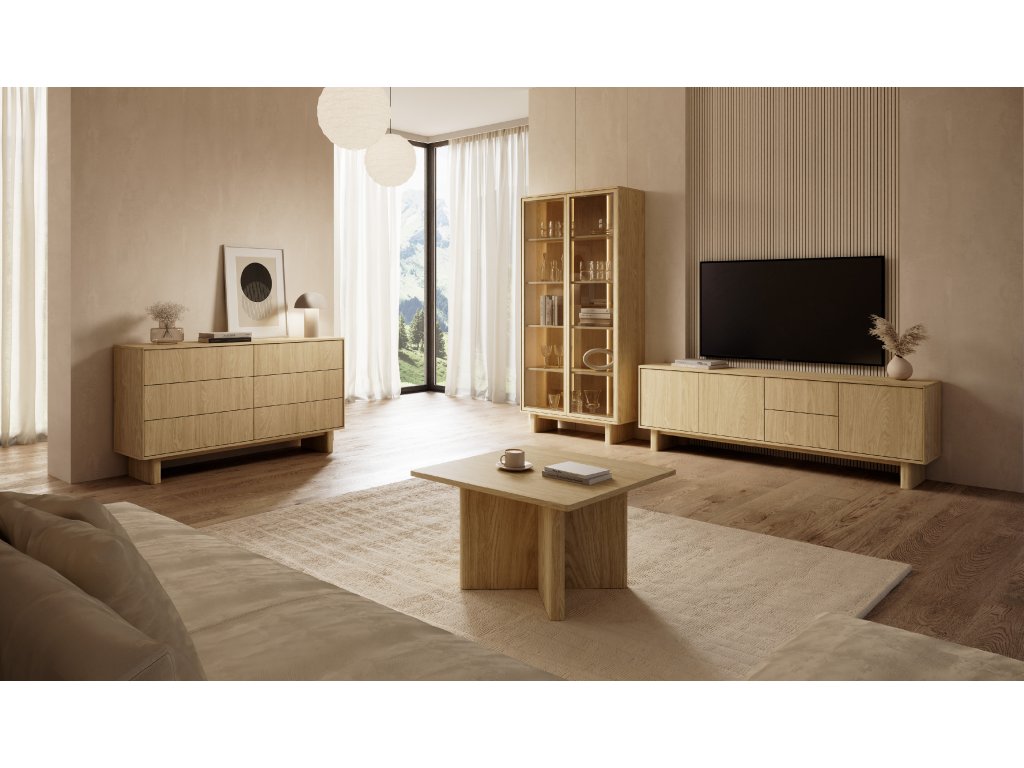 Přední plochy jsou řešeny čistě, bez úchytek – praktické push-to-open otevírání zajišťuje pohodlné používání a minimalistický vzhled. Zadní části a zásuvky jsou z HDF v dekoru olejovaného dubu, což zachovává jednotný přírodní charakter.