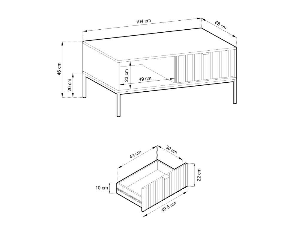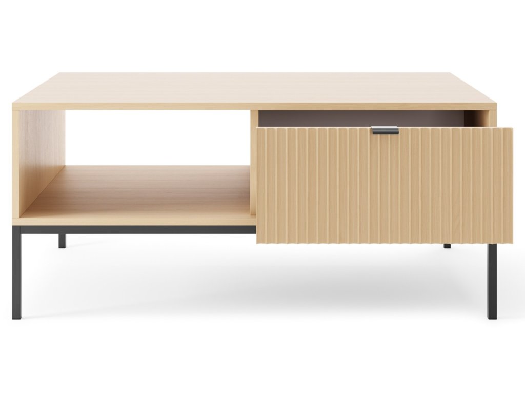 Zvýrazníte váš obývací pokoj novým konferenčním stolkem se zásuvkou Novas. Stolek vyniká moderním designem, který ve vašem interiéru zazáří. Přední drážkované části jsou doplněny o úchyty v černé barvě z hliníku. Stolek do obývacího pokoje stojí na černé konstrukci, která mu dodává lehkost.