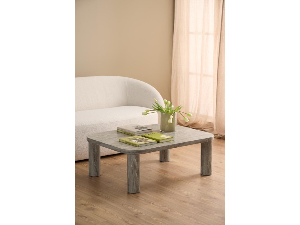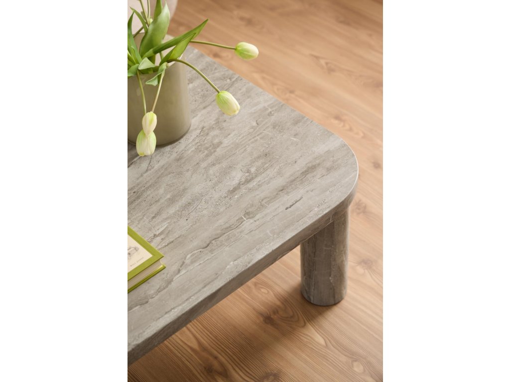 Konferenční stolek Solano je navržen jako výrazný středobod obývacího pokoje, který kombinuje robustní proporce s rafinovaným vzhledem šedého mramoru River. Jeho obdélníková deska se zaoblenými rohy a výrazné kulaté nohy dodávají nábytku sochařský charakter a působivou přítomnost v prostoru.