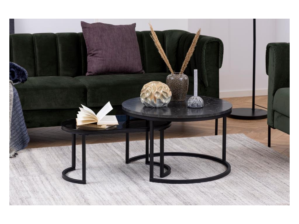 Tato souprava konferenčních stolků je poutavým designovým prvkem, který vynikne zejména v moderních interiérech. Kombinace kouřového skla a černého mramorového vzhledu dodává nábytku na eleganci a hluboké vizuální zajímavosti. Geometrická souhra kulatého a oválného tvaru vytváří harmonickou rovnováhu mezi symetrií a kreativitou. Černá práškově lakovaná ocelová základna podtrhuje industriální charakter a zároveň poskytuje pevnou oporu. Díky své flexibilitě lze stolky umístit samostatně nebo společně – podle potřeby prostoru.
