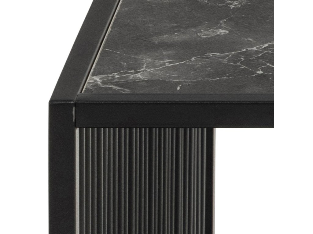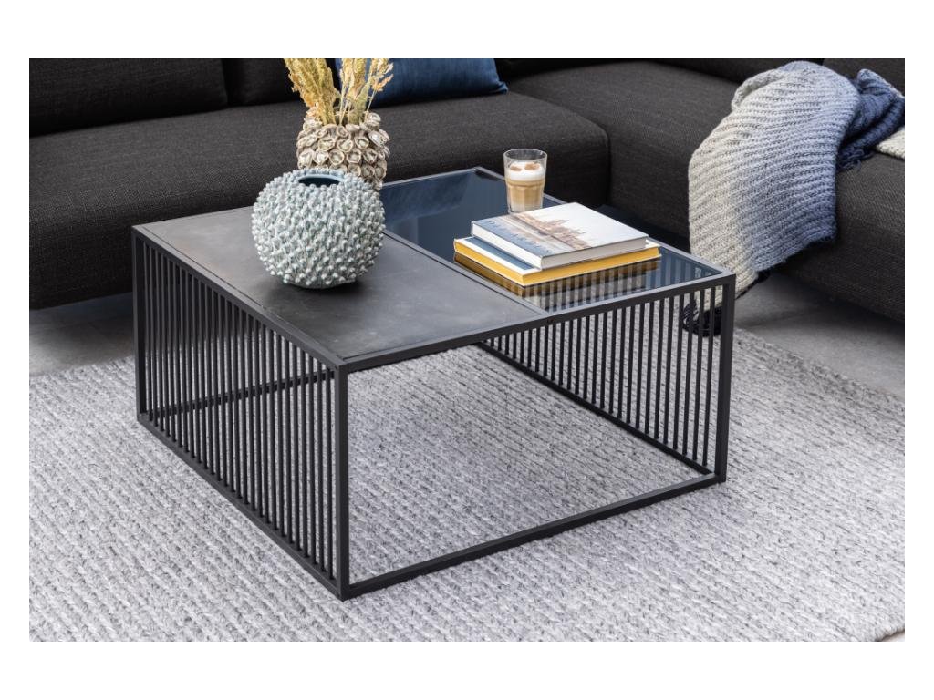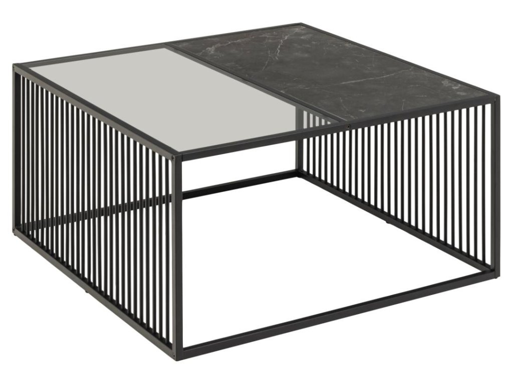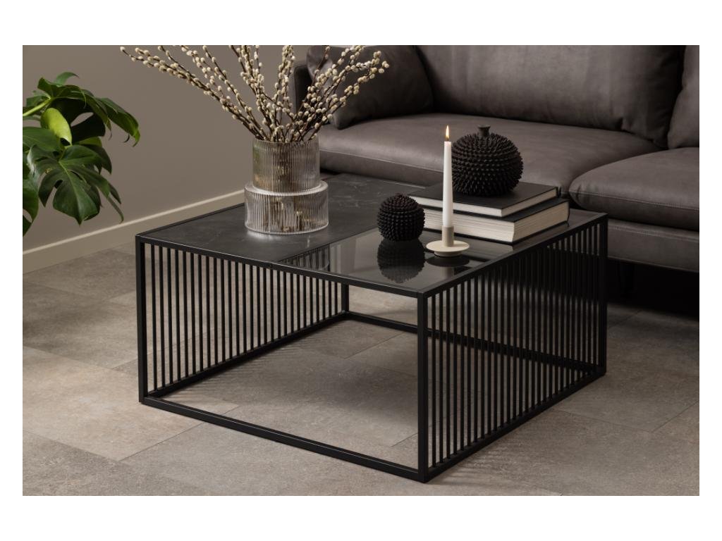 Tento konferenční stolek z kolekce Strington ve čtvercovém provedení nabízí harmonickou rovnováhu mezi geometrickou čistotou a designovým kontrastem. Stolová deska je rozdělena na dvě části – jedna je z kouřového tvrzeného skla, druhá z matného černého melaminu v dekoru Izmir s mramorovým vzhledem. Boky stolku doplňují zaoblené, svislé kovové lamely, které zvýrazňují jeho architektonický charakter a zároveň zajišťují vizuální lehkost. Kompaktní rozměr činí ze stolku ideální řešení do menších obývacích prostor nebo jako doplněk k většímu kusu ze stejné kolekce.