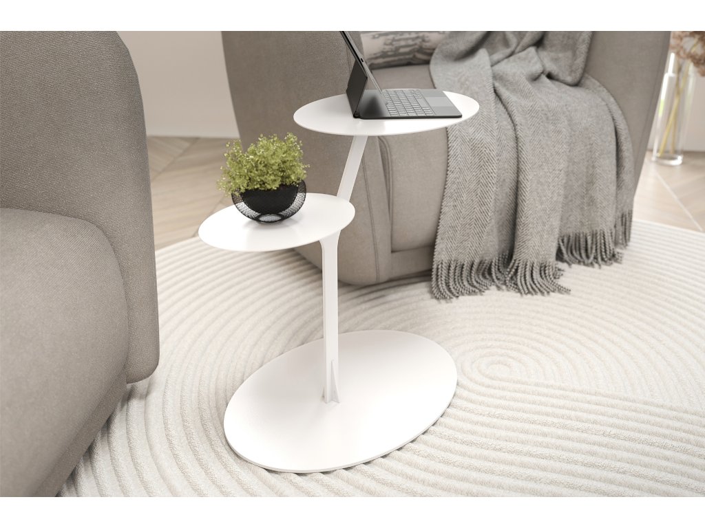 Bílý stolek Iroko přináší do interiéru čistotu, světlo a vizuální lehkost. Díky svému sochařskému tvaru a jemnému odstínu je ideální do moderních, skandinávských nebo japandi prostor. Dvouúrovňová konstrukce poskytuje praktický odkládací prostor, aniž by působila těžkopádně. Lakovaný povrch je odolný vůči oděru, takže stůl si zachová svůj vzhled i při každodenním používání.