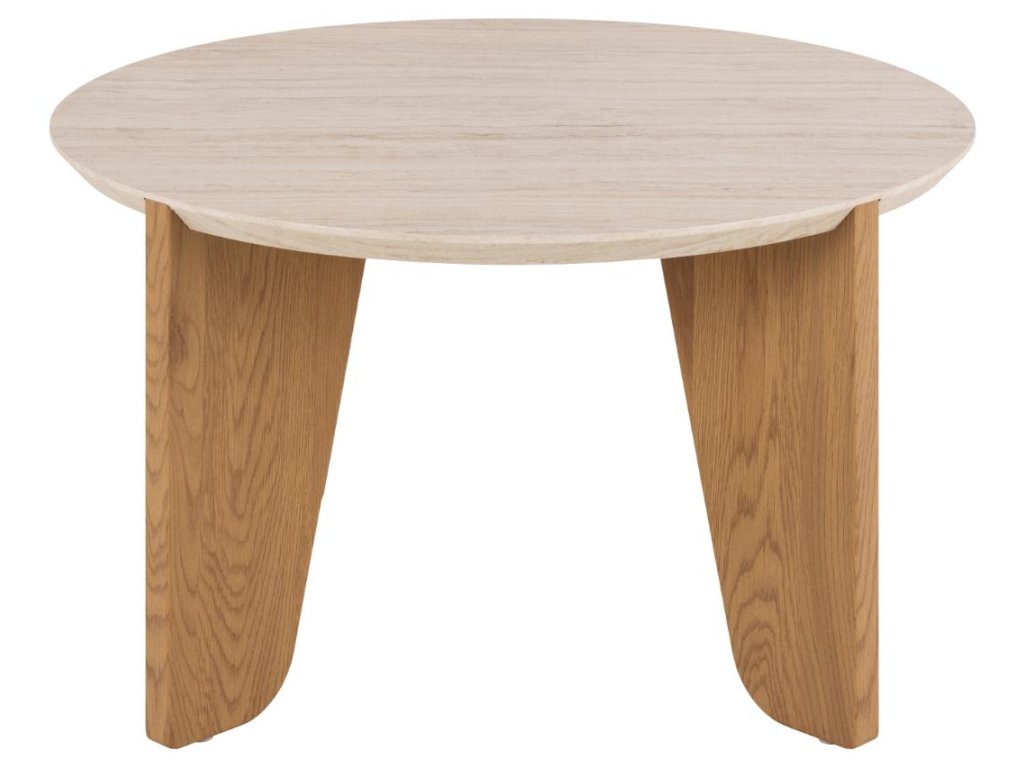 Kulatý konferenční stolek Dockland, Ø80x45 cm, spojuje vzhled travertinu a divokého dubu, čímž vytváří harmonickou kombinaci přírodních tónů a moderního stylu. Díky svému organickému designu s jemně zaoblenými hranami a broušenýma nohama působí jako výrazný vizuální prvek v každém moderním obývacím pokoji. Kulatá deska s realistickým travertinovým efektem se opírá o stabilní základnu ve vzhledu matného divokého dubu, což dodává stolku útulnost a eleganci zároveň.