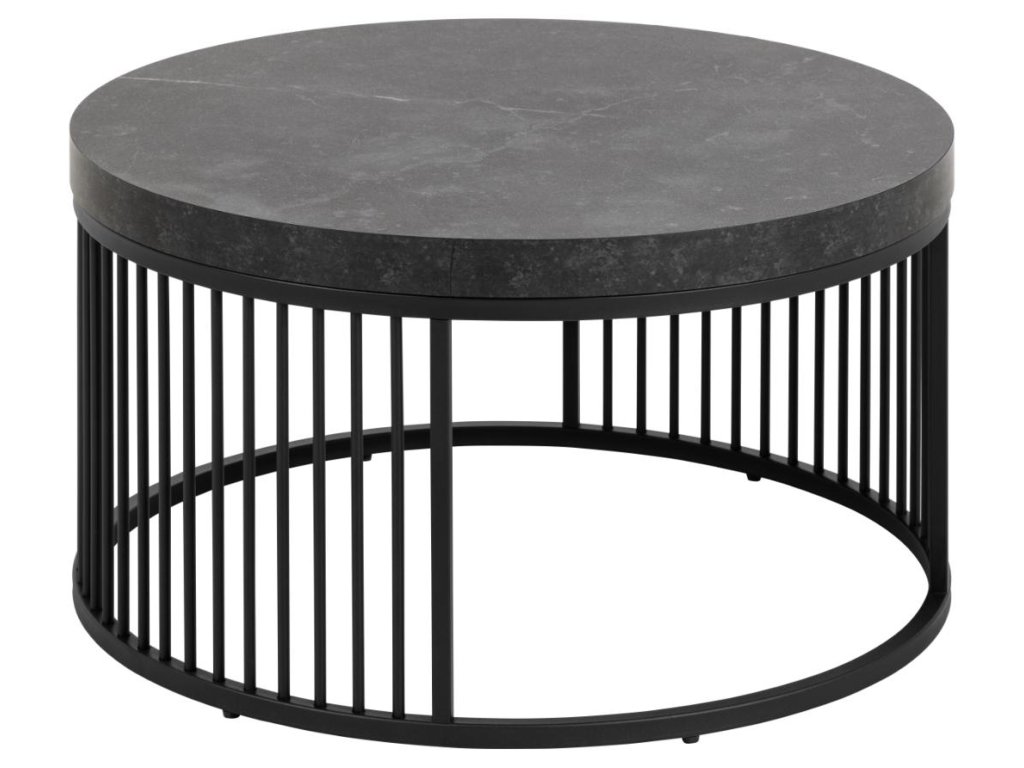 Tento kulatý konferenční stolek z kolekce Strington vyniká kombinací černého mramorového vzhledu a jemné ocelové geometrie. Vrchní deska v dekoru matné černé Izmir (melamin) působí sofistikovaně a je zasazena do černého ocelového rámu se svislými dráty, které mu dodávají moderní architektonický výraz. Díky svému kompaktnímu průměru 65 cm a výšce 35 cm je ideální do obývacího pokoje jako hlavní nebo doplňkový konferenční stolek. Minimalistický tvar a kontrast materiálů z něj dělají poutavý a zároveň nadčasový prvek každého prostoru.
