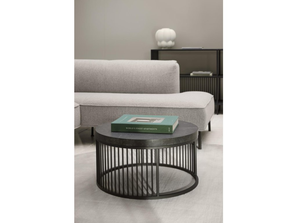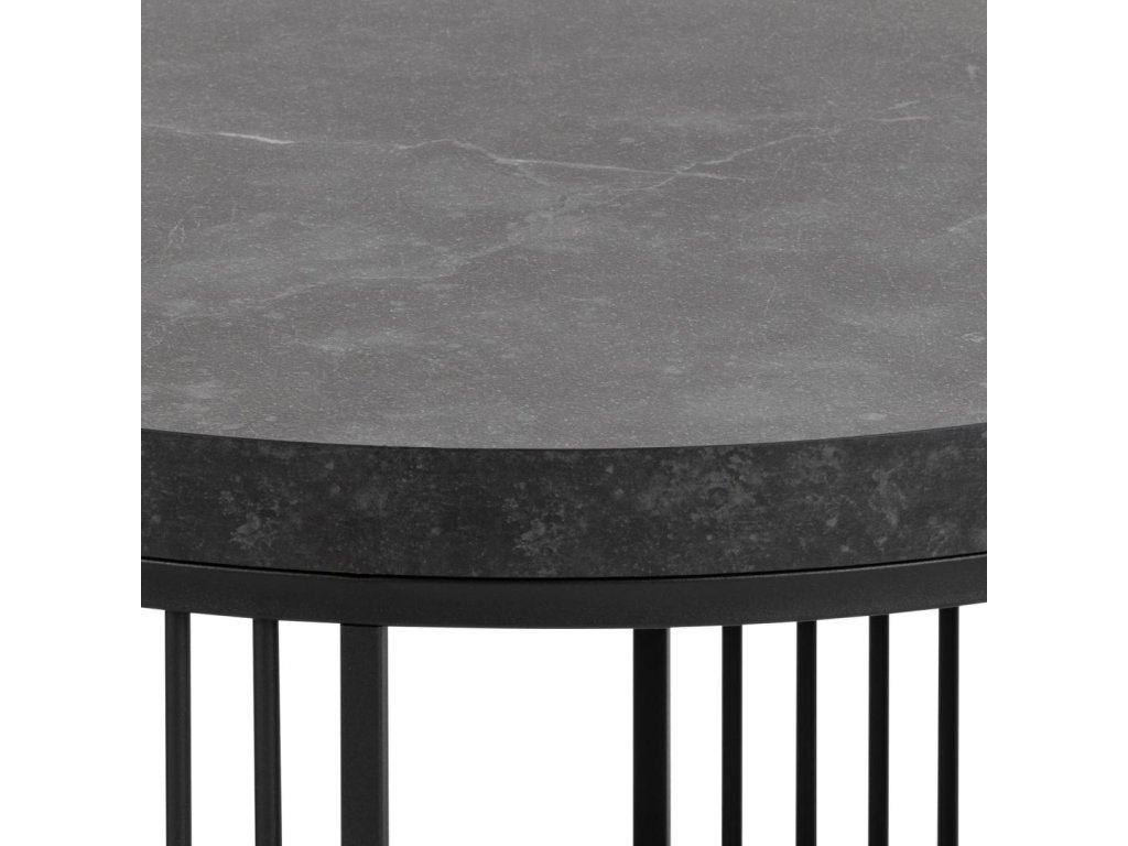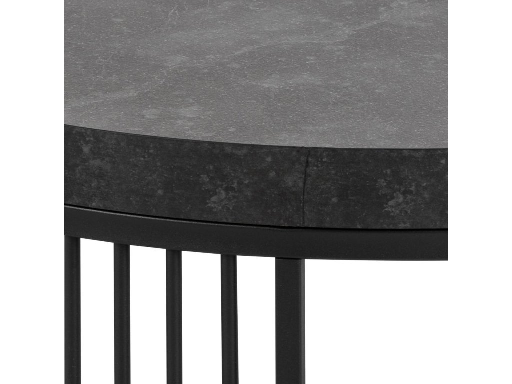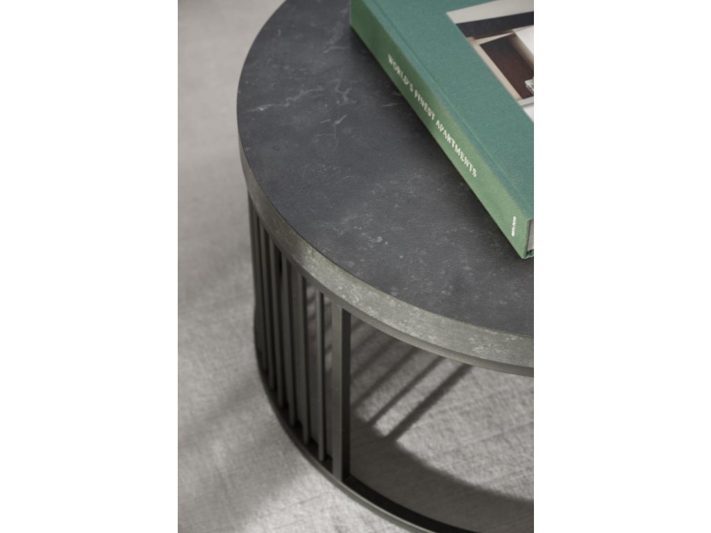 Tento kulatý konferenční stolek z kolekce Strington vyniká kombinací černého mramorového vzhledu a jemné ocelové geometrie. Vrchní deska v dekoru matné černé Izmir (melamin) působí sofistikovaně a je zasazena do černého ocelového rámu se svislými dráty, které mu dodávají moderní architektonický výraz. Díky svému kompaktnímu průměru 65 cm a výšce 35 cm je ideální do obývacího pokoje jako hlavní nebo doplňkový konferenční stolek. Minimalistický tvar a kontrast materiálů z něj dělají poutavý a zároveň nadčasový prvek každého prostoru.