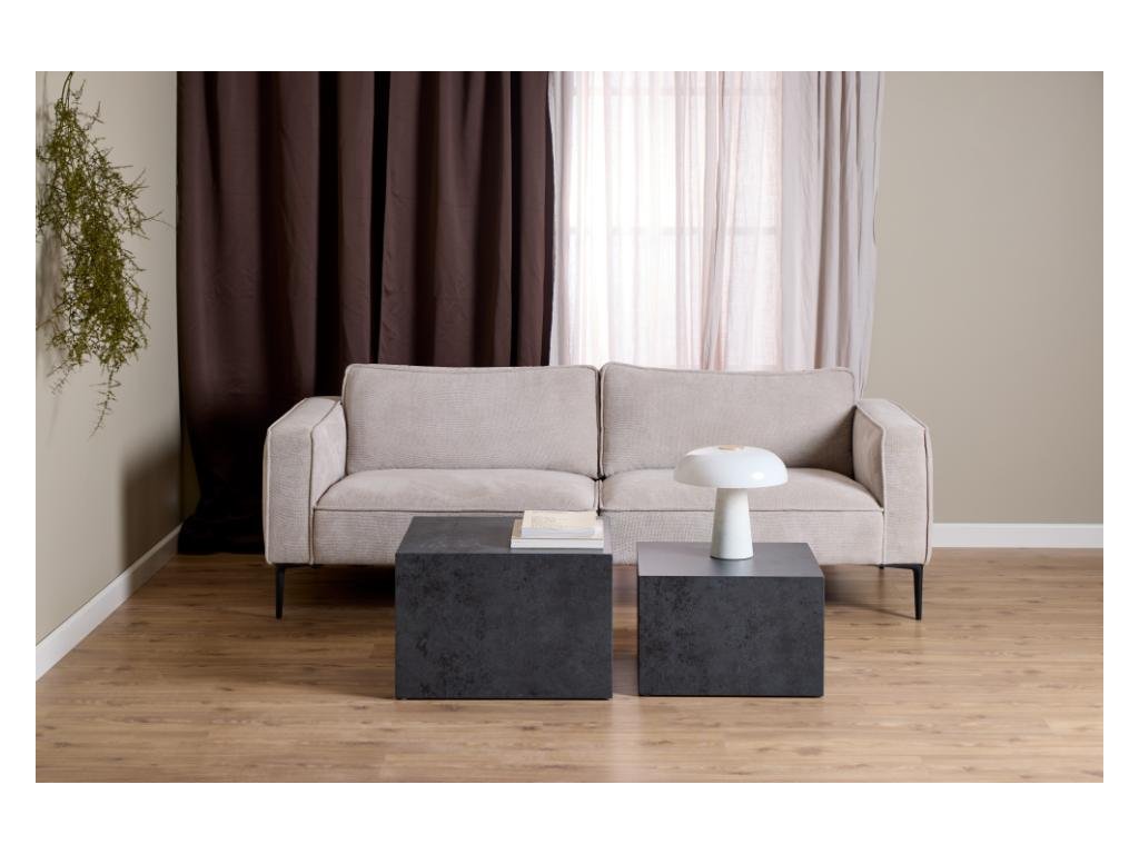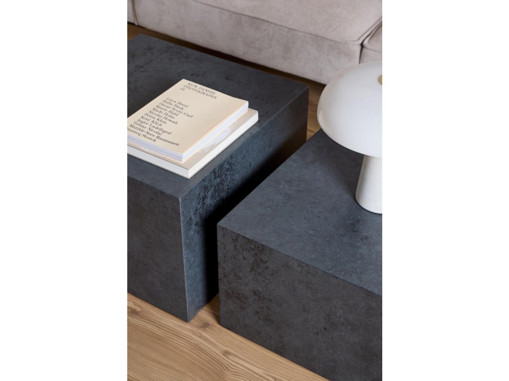 Tyto černé stolky ve tvaru krychle jsou ztělesněním industriální elegance. Jejich syrový povrch a výrazná barva dodají místnosti hloubku a kontrast. Skvěle ladí s kovovými nebo koženými doplňky – ideální pro moderní interiéry.