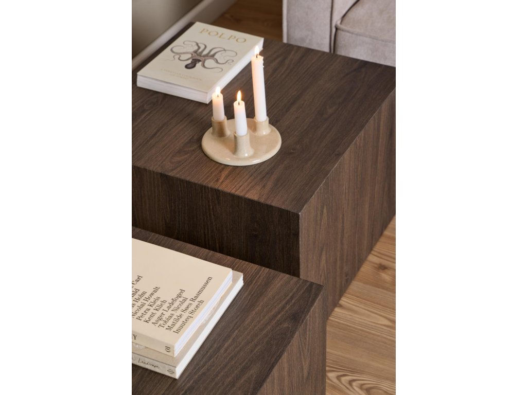 Souprava stolků v dekoru zakouřeného dubu nabízí vizuální teplo a strukturu. Tento přirozený vzhled je ideální do útulných, ale stylových prostor. Hodí se do interiérů v rustikálním nebo severském stylu.