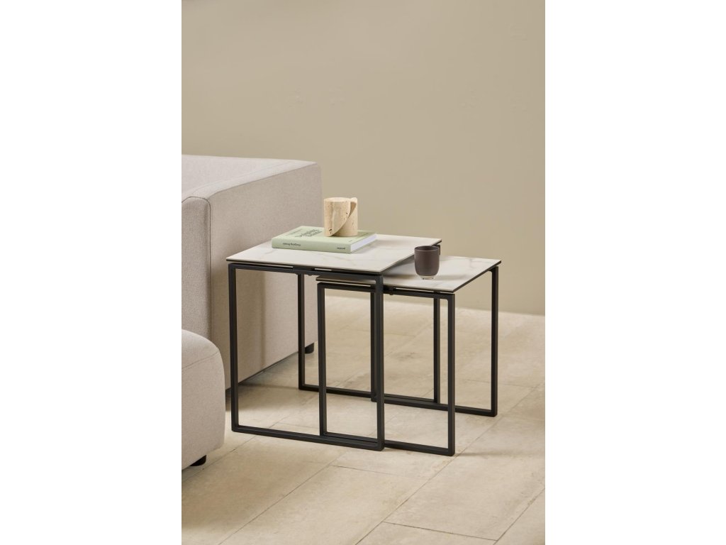 Tato moderní dvoudílná souprava stolků spojuje čistotu bílé drsné keramické desky Akranes s kontrastní černou ocelovou základnou. Výrazný kontrast vytváří elegantní, grafický vzhled, který vynikne v moderních i minimalistických interiérech. Díky své praktické velikosti jsou ideální vedle pohovky, křesla nebo jako noční stolek. Keramická deska je odolná vůči teplu i poškrábání, takže stolky nejen dobře vypadají, ale také něco vydrží.