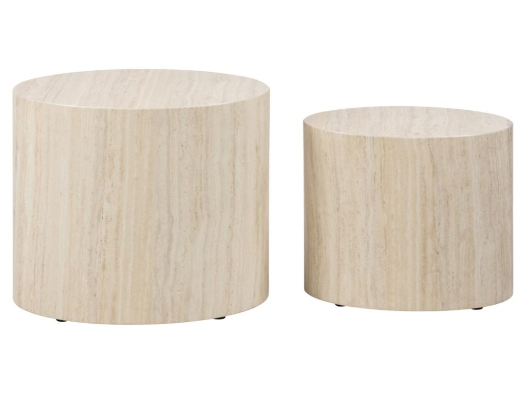 Oválná sada konferenčních stolků Mice je dostupná iv elegantním provedení béžový travertin. Tento přírodně působící design dodává interiéru jemný, sofistikovaný vzhled a výborně zapadne do světlých, neutrálně laděných prostor. Oválný tvar a možnost zasunutí menšího stolku pod větší dělají ze soupravy praktický a zároveň estetický doplněk.