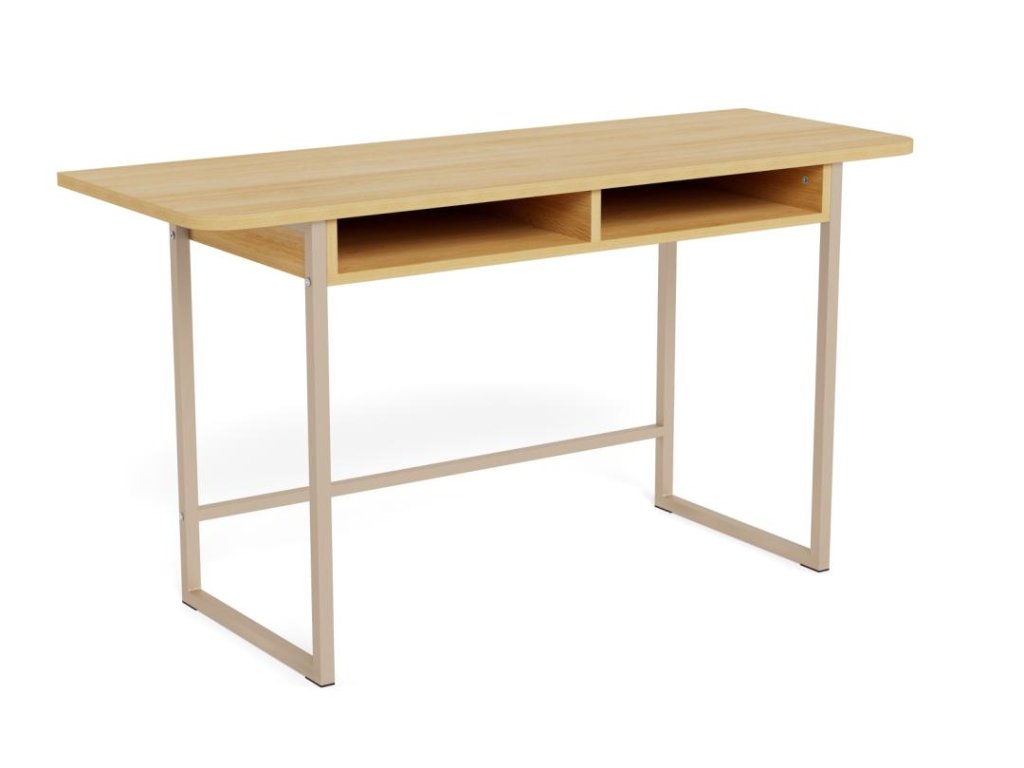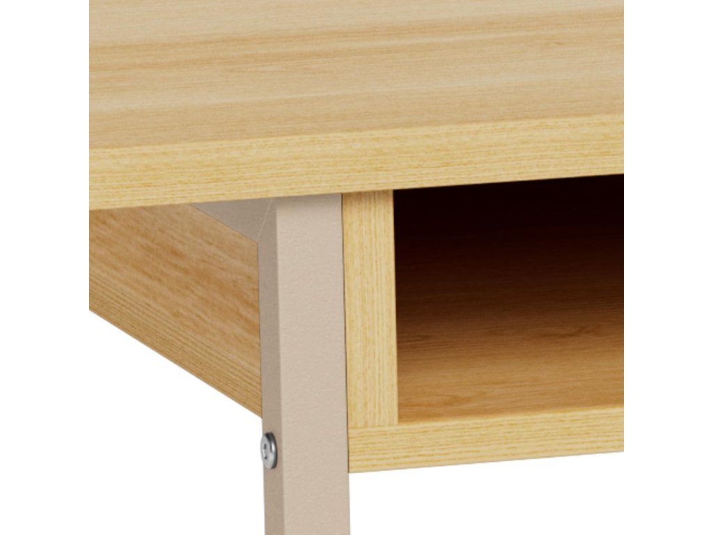 Vrchní deska v dubovém vzhledu je snadno udržovatelná, odolná a příjemně teplá na pohled. Robustní kovová základna ve tvaru saní s hrubým šedým práškovým nástřikem zaručuje stabilitu i stylový kontrast. Dvě otevřené přihrádky poskytují místo pro odkládání dekorací, knih nebo drobností, které chcete mít po ruce.