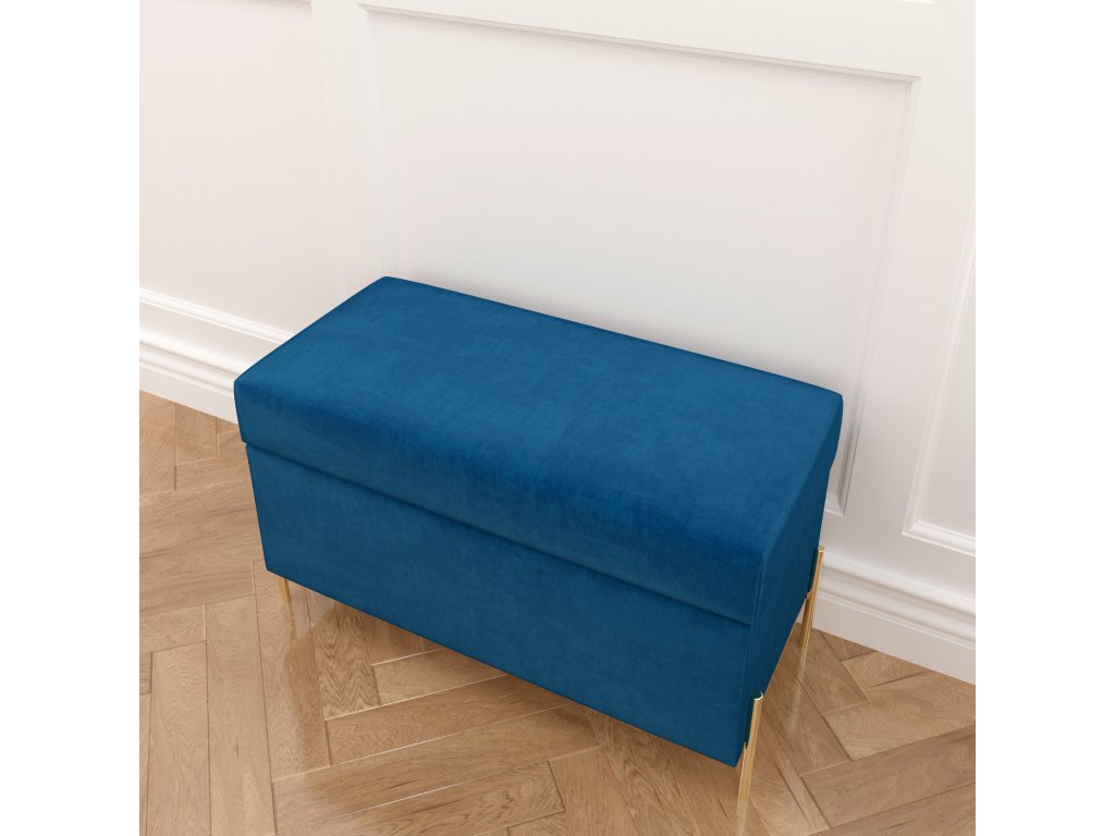 Modrá taburetka s úložným prostorem Borgo vynikne v každé předsíni a chodbě. Do interiéru vnese elegantní nádech s kouskem extravagance. Taburetka disponuje úložným prostorem, do kterého vložíte čepice, rukavice, šály nebo jiné drobnosti. Moderní design se zlatými nožičkami přitáhne oči všech návštěvníků.
