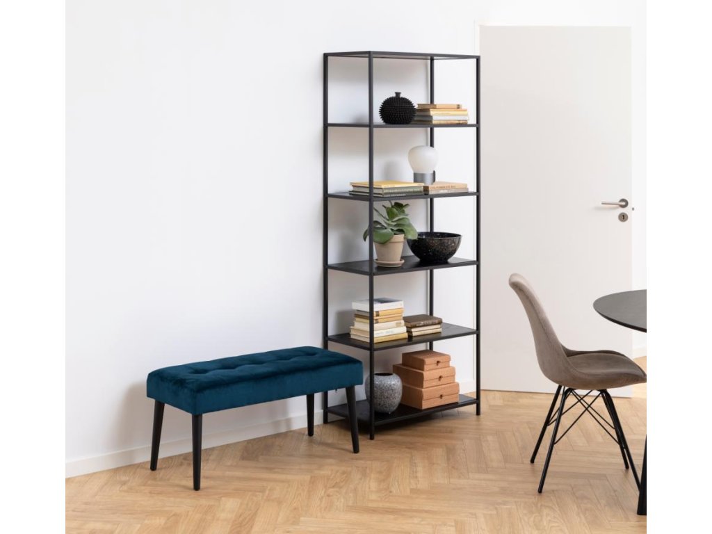 Modrá lavice Glory v tmavě modré látce Vic s černou ocelovou konstrukcí nabízí stylové sezení do předsíně nebo ložnice. Všívaný detail zvyšuje vizuální dojem a eleganci. Pevná ocelová základna zaručuje stabilitu. Vhodná do moderního interiéru s industriálním nádechem.