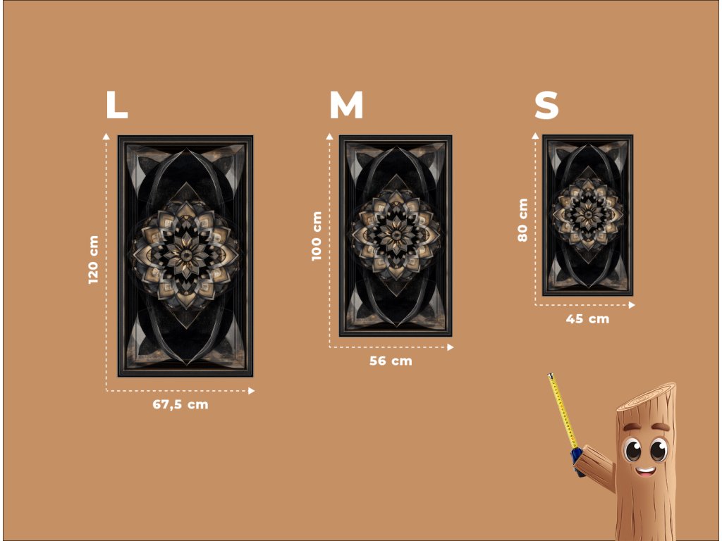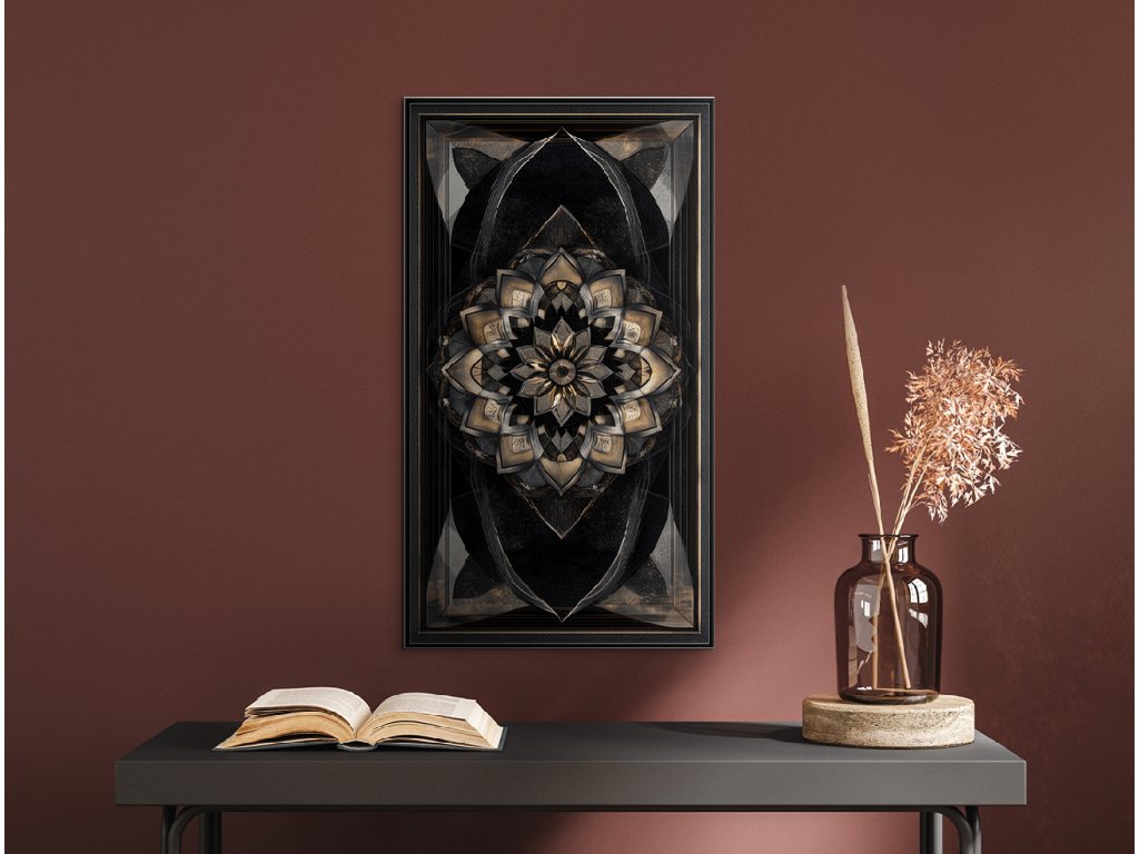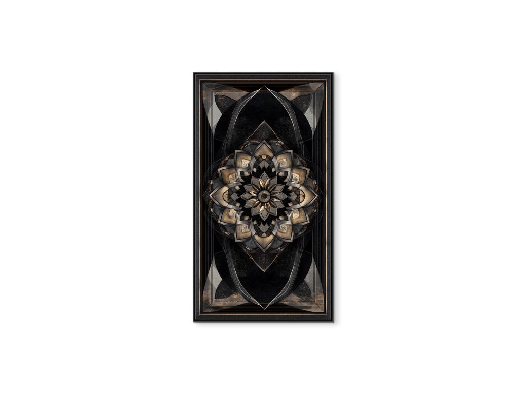 Vertikálně orientované umělecké dílo s bohatým mandalovým motivem ve zlaté a bronzové, kontrastující s tmavým pozadím. Lesklé prvky a symetrie dodávají dílu luxusní a prostorový efekt, ideální pro moderní a sofistikovaný interiér.