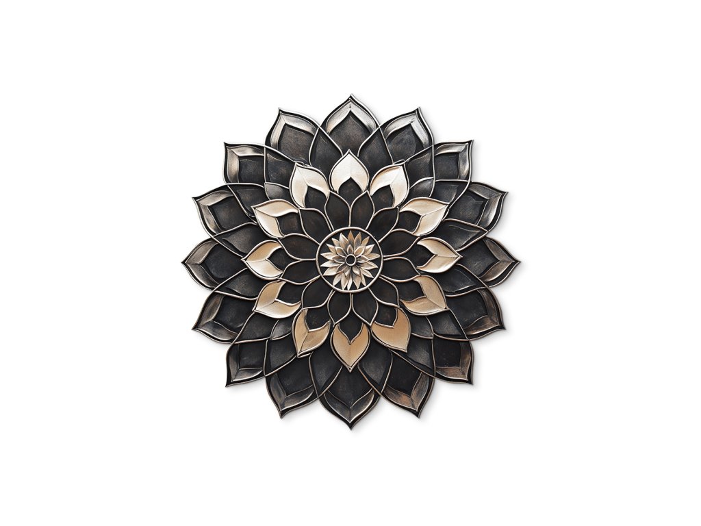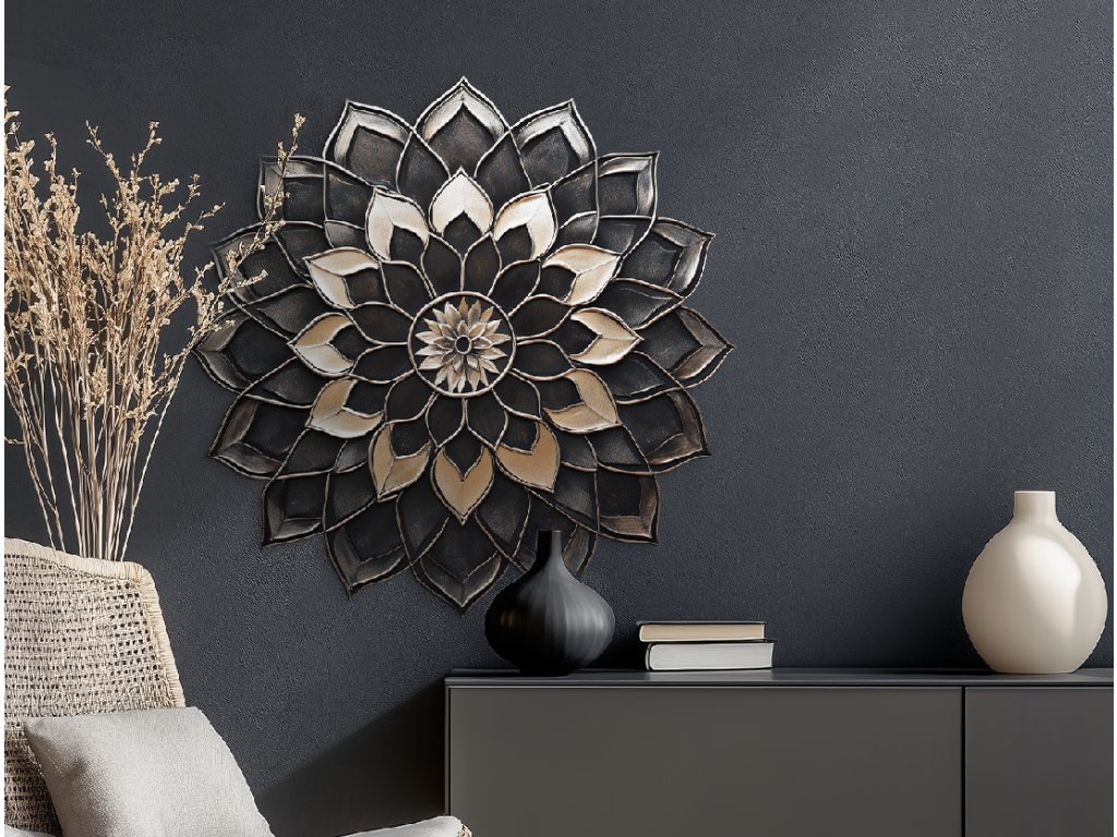 Elegantní kruhová dekorace s vrstvenými okvětními lístky vytváří dojem zářícího slunce. Tmavé vnější a lesklé vnitřní části přinášejí kontrast a hloubku, přičemž středový květinový detail umocňuje umělecký výraz. Skvělá volba pro stylové oživení interiéru.