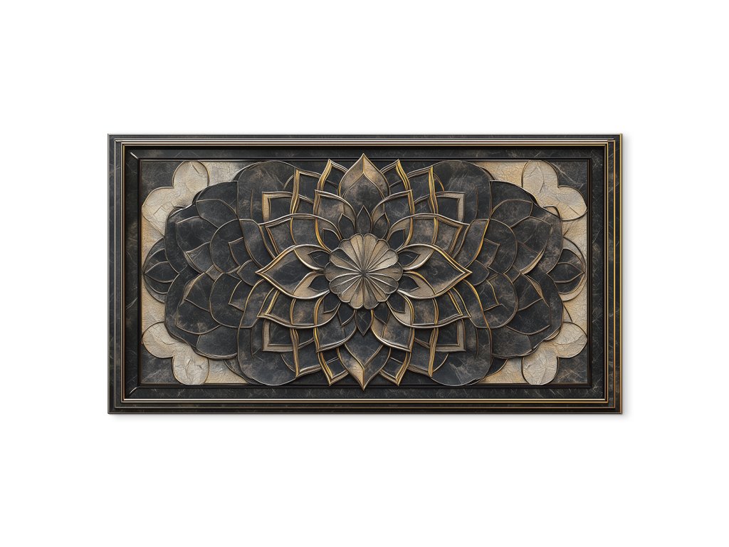 Detailně zpracovaný reliéf s květinovým nebo mandalovým motivem vytváří výrazný trojrozměrný efekt. Tmavé kovové textury s jemnými zlatými akcenty zvýrazňují jednotlivé vrstvy a dodávají dílu elegantní a starožitný charakter.
