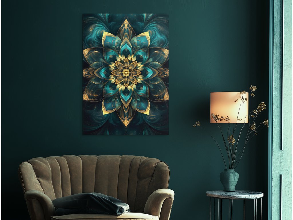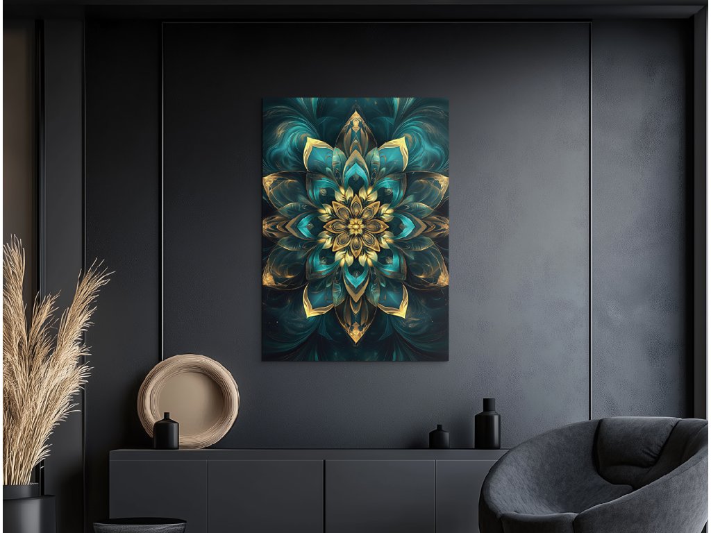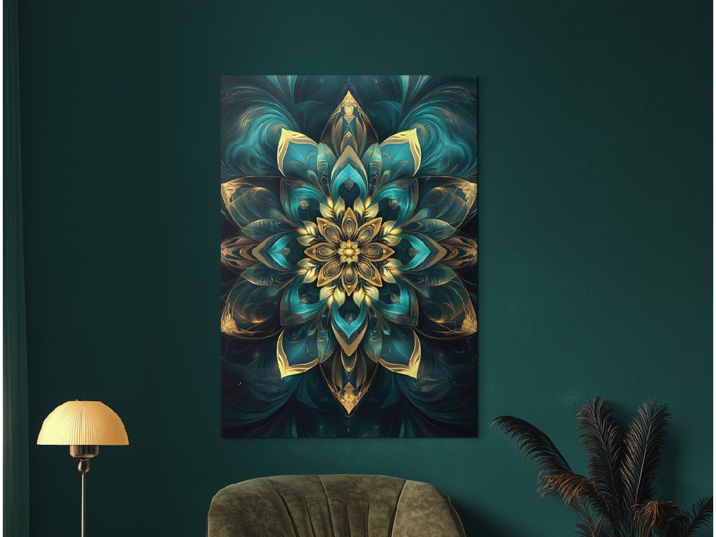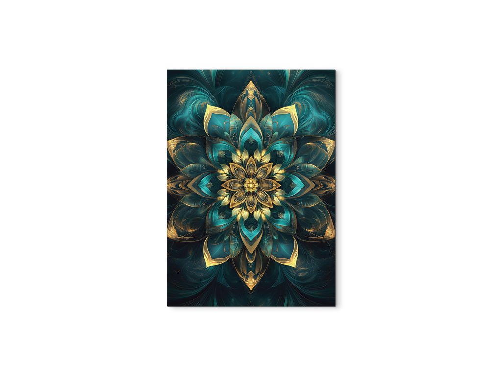 Elegantní vertikální mandala zobrazuje detailní květinově-symetrický vzor v kombinaci tyrkysových a zlatých tónů. Díky harmonickému lesku a preciznímu designu působí luxusně a zároveň uklidňujícím dojmem – ideální jako dekorace do moderních i boho interiérů.