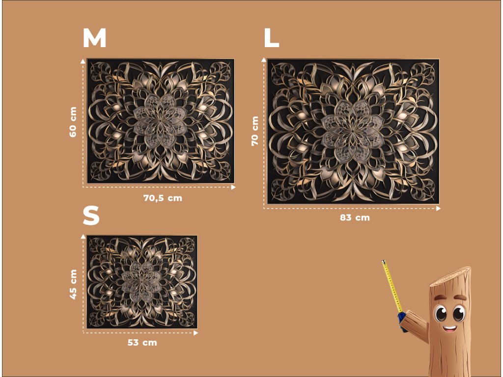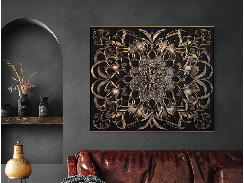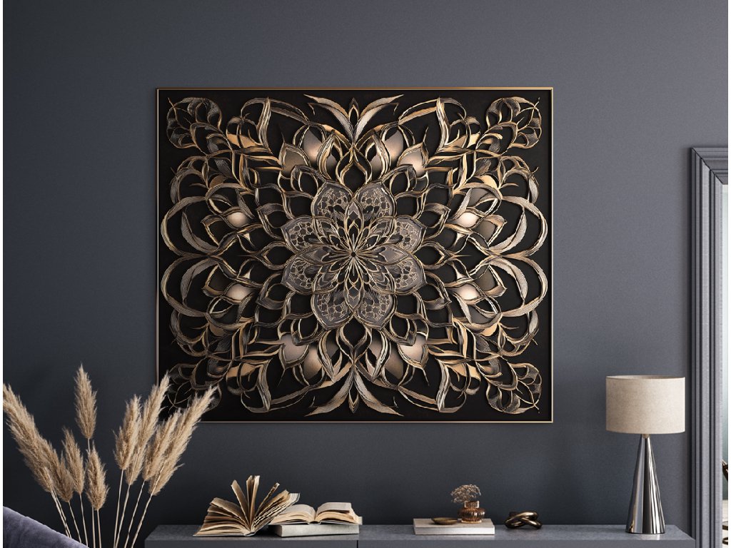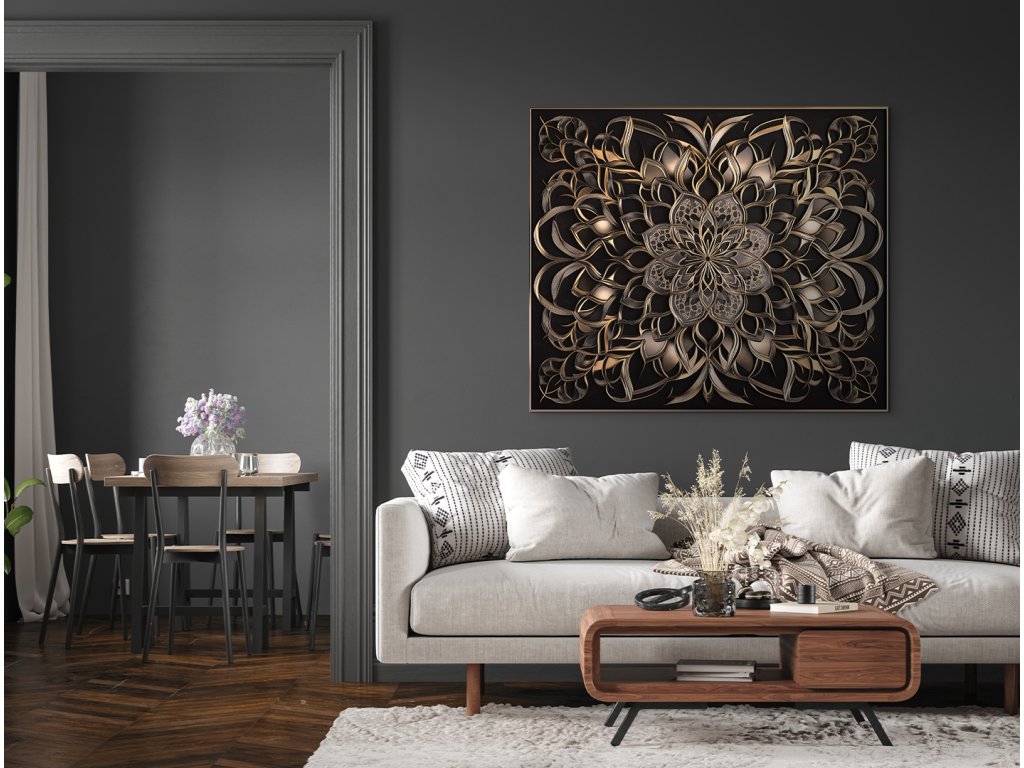 Mandala zobrazuje detailní, symetrický květinový motiv v odstínech zlaté a bronzové, který vytváří efekt hloubky a trojrozměrnosti. Celý vzor vyniká na tmavém pozadí, což zdůrazňuje jeho eleganci a strukturu.