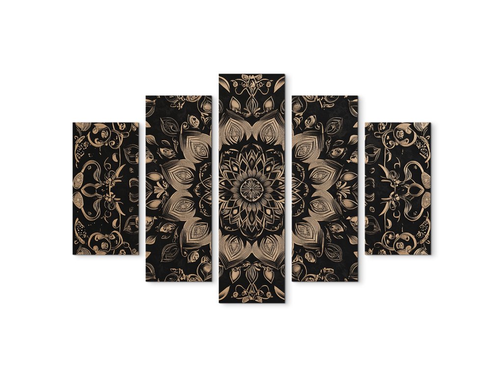 Pětidílný obrazový set se symetricky rozloženou mandalou ve zlaté a černé barvě vytváří působivý vizuální efekt. Centrální panel dominuje detailní kresbou, zatímco krajní části dotváří harmonický rám. Elegantní provedení působí luxusně a uklidňujícím dojmem.