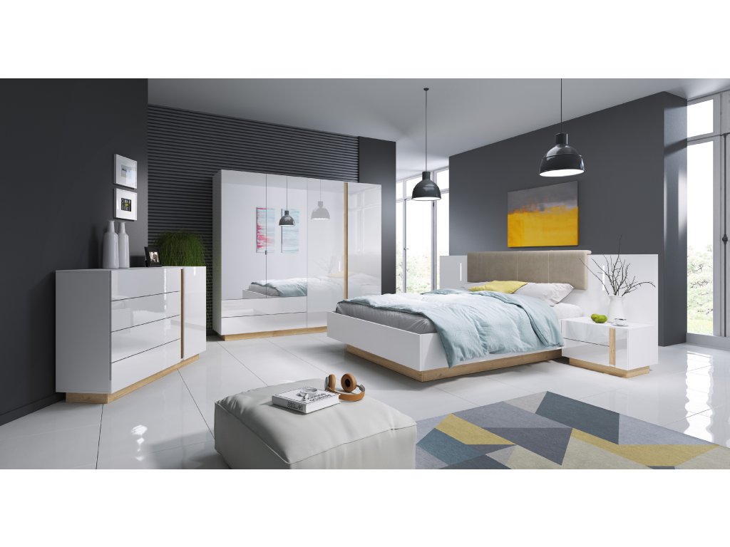Kolekce Arcon přináší kombinaci bílého matu, vysokého bílého lesku a přírodního dekoru dub grandson, která působí elegantně a zároveň útulně. Moderní design doplňují hliníkové úchytky a funkční push-to-open systém. Postel z kolekce nabízí čalouněné čelo a úložný prostor, přičemž k dispozici je i verze se zvedacím kovovým roštem. Vybrané prvky lze doplnit o LED osvětlení, které zvýrazní jejich design a praktické využití.