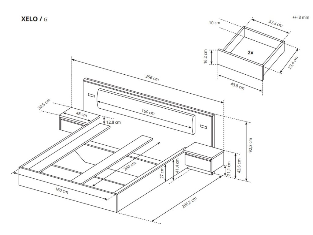 Kolekce Xelo je vyrobena z kvalitní laminované dřevotřísky E05, doplněná o odolné ABS hrany a elegantní MDF lišty. Spojuje moderní vzhled a praktičnost, čímž vytváří ideální základ pro stylovou a funkční ložnici.