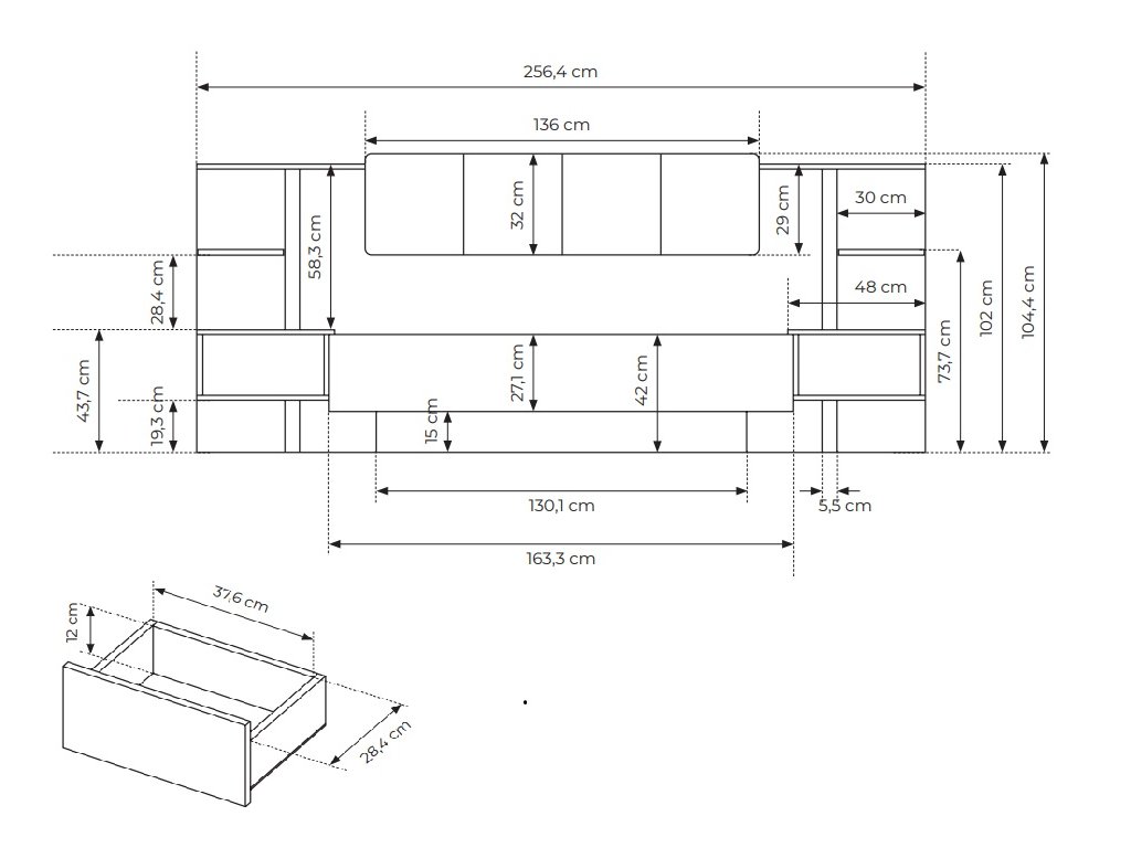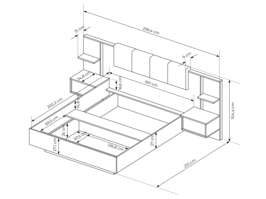 Postel se dodává s lamelovým roštem s dřevěným rámem, který však není otevírací – přístup do prostoru pod postelí je tedy omezený. Rozměry postele jsou 256,4 × 210 × 104,4 cm, přičemž plocha na spaní má 160 × 200 cm. Matrace není součástí balení!