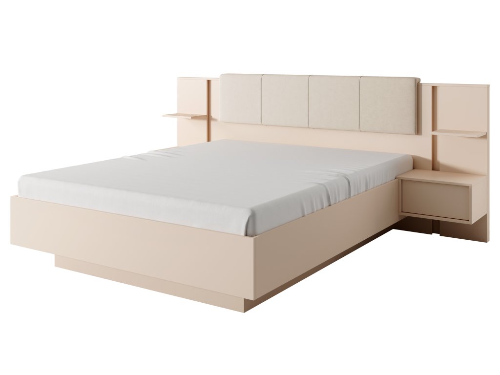 Manželská postel Dast je elegantním centrem ložnice, které spojuje moderní design s praktickými detaily. Postel je vyhotovena v jemné béžové barvě, doplněné o krémové čalouněné čelo, které působí útulně a zároveň poskytuje pohodlí při čtení či relaxování. Součástí konstrukce čela jsou i integrované noční stolky – každý má jednu zásuvku a malou poličku nad stolkem, což poskytuje dostatek prostoru pro odkládání drobností.