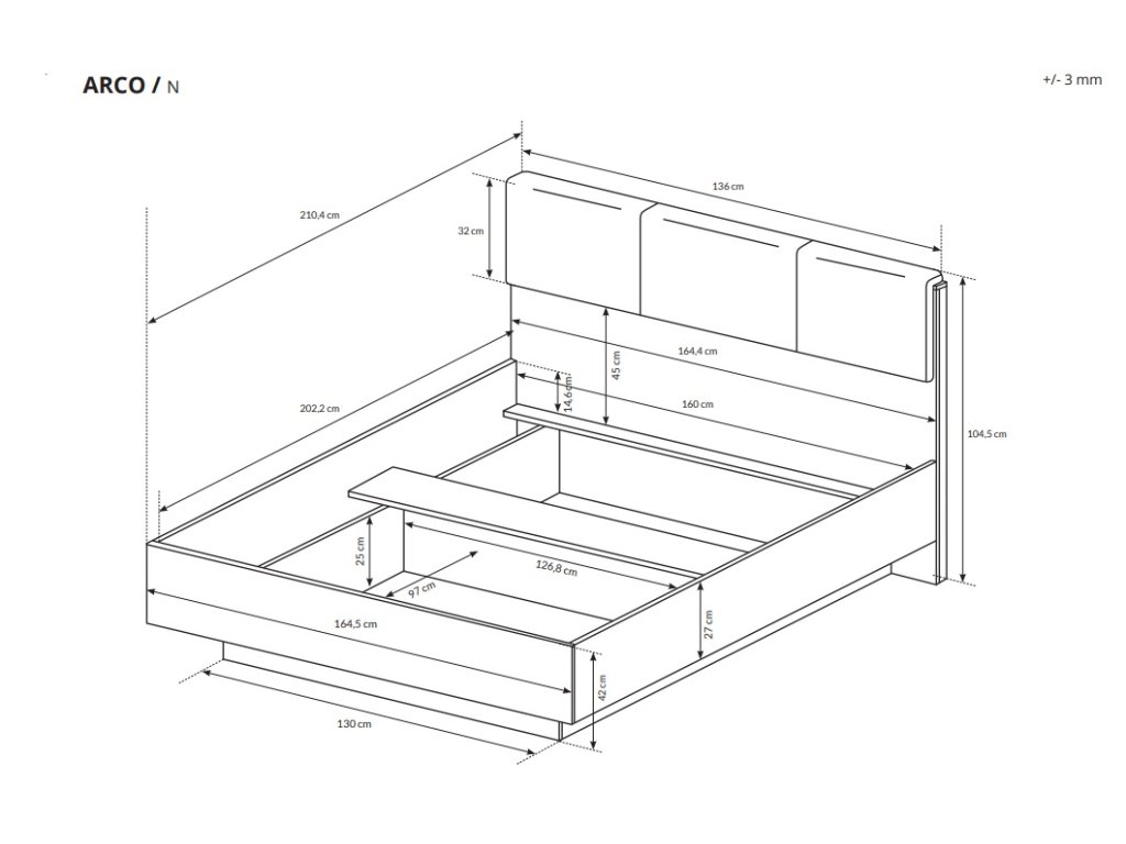 Kolekce Arcon přináší kombinaci bílého matu, vysokého bílého lesku a přírodního dekoru dub grandson, která působí elegantně a zároveň útulně. Moderní design doplňují hliníkové úchytky a funkční push-to-open systém. Postel z kolekce nabízí čalouněné čelo a úložný prostor (dle verze), přičemž lze zvolit i variantu bez zdvihacího mechanismu. Vybrané prvky lze doplnit o LED osvětlení, které zvýrazní jejich design a praktické využití.