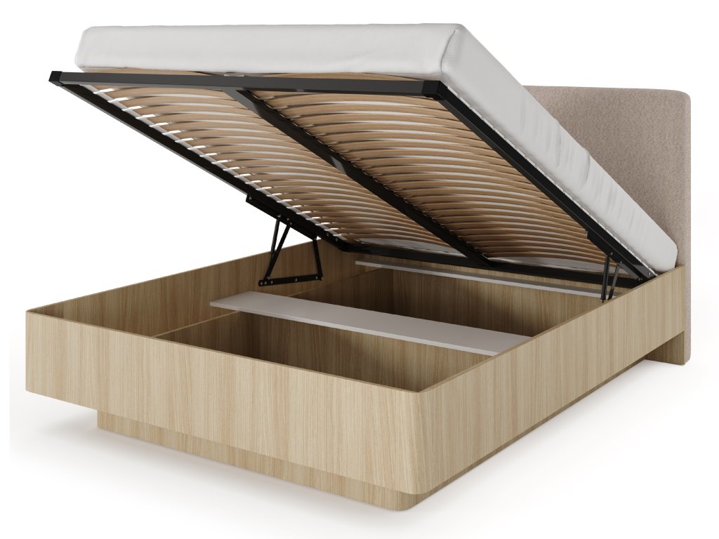 Postel Viki D UP 160 x 200 cm nabízí ideální spojení komfortu, přírodního designu a praktického řešení v podobě úložného prostoru. Vysoké čalouněné čelo v krémové barvě poskytuje měkkou oporu při sezení a vizuálně zjemňuje robustní tělo postele v dekoru dub barista. Integrovaný úložný prostor na ložní prádlo je snadno přístupný pomocí zdvihacího mechanismu s plynovými písty. Postel se dodává bez matrace, což umožňuje vybrat si vlastní dle preferovaného komfortu. Celkové zpracování doplňují jemně zaoblené hrany, přírodní dřevěné detaily a stabilní konstrukce, která vnáší do ložnice pocit tepla a domova.