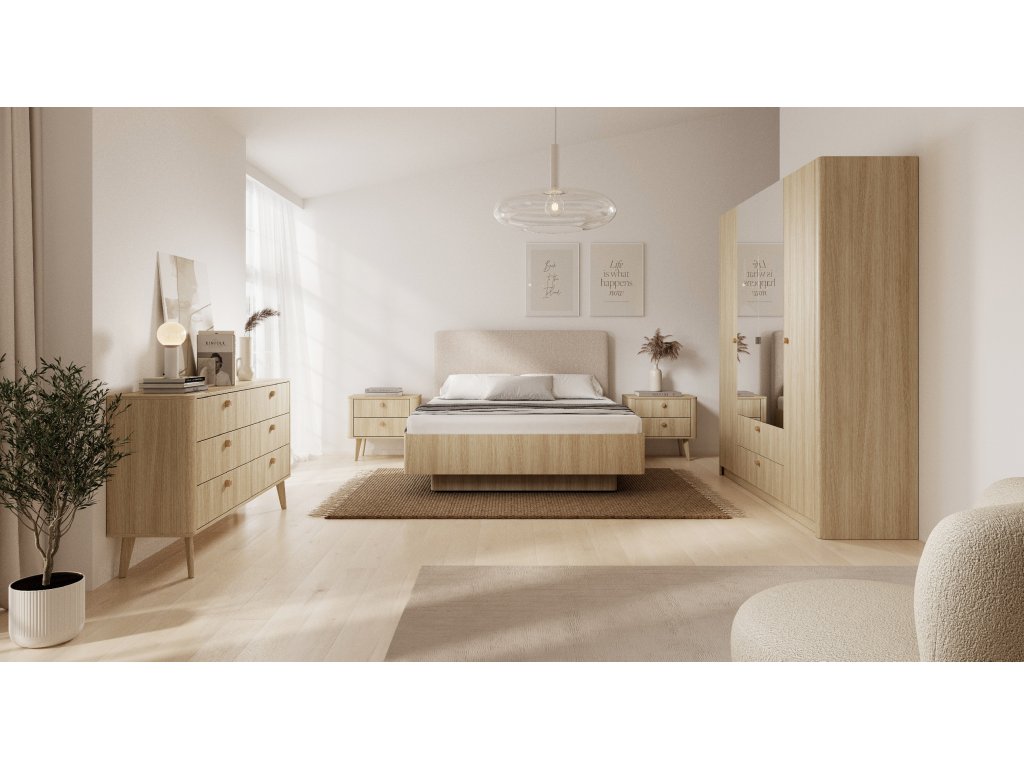Manželská postel Viki D je elegantním a pohodlným centrem každé ložnice, která staví na přírodních tónech a jemných detailech. Kombinuje teplý dekor dub barista s měkkým čalouněným čelem v krémové barvě, které poskytuje komfortní oporu při čtení nebo odpočinku. Postel je vybavena dřevěným roštem a dodává se bez matrace, což ocení zejména ten, kdo upřednostňuje vlastní výběr svého komfortu. Jemně zaoblené detaily a celkový přirozený vzhled podtrhují harmonický styl kolekce Viki.