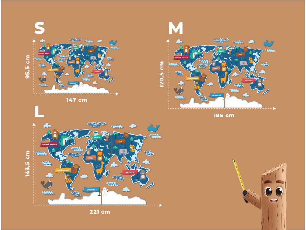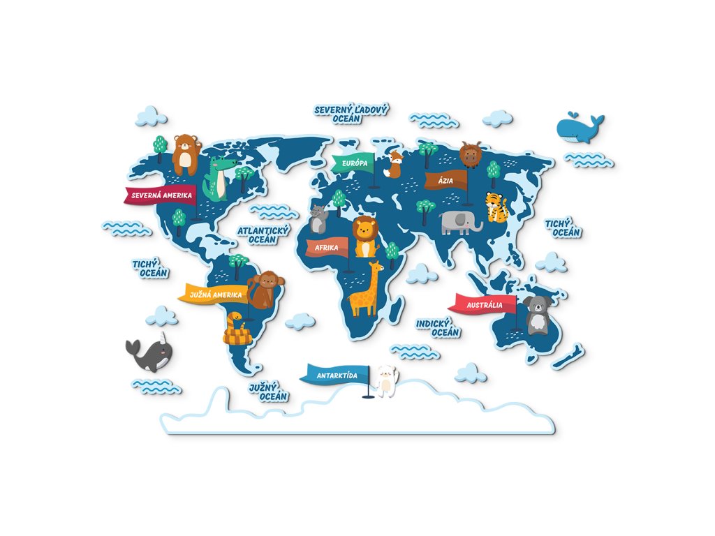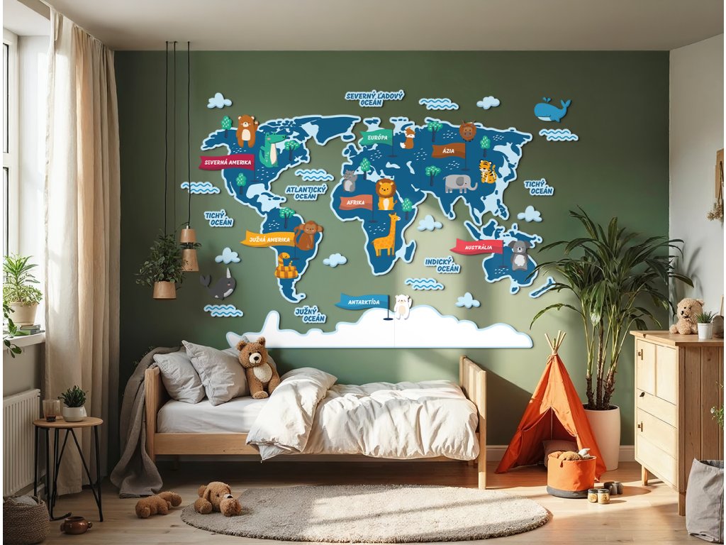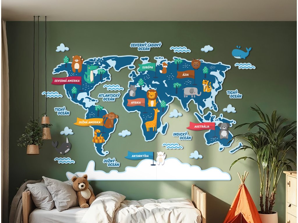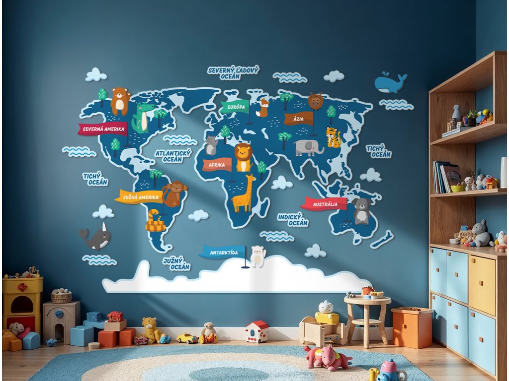 Dětská mapa světa se zvířátky v modré barvě promění pokojíček v malé dobrodružství! Děti se naučí kde hledat Afriku či Evropu, oceány a navíc se naučí kde žijí zvířátka – lev i tygr, slon, lední medvěd, koala či velryba. Nádherné barevné zpracování a nápisy a roztomilé ilustrace, dělají z mapy nejen dekoraci, ale i hravého průvodce poznáváním světa. Stačí jeden pohled a dětská fantazie se rozjede na cesty kolem planety.