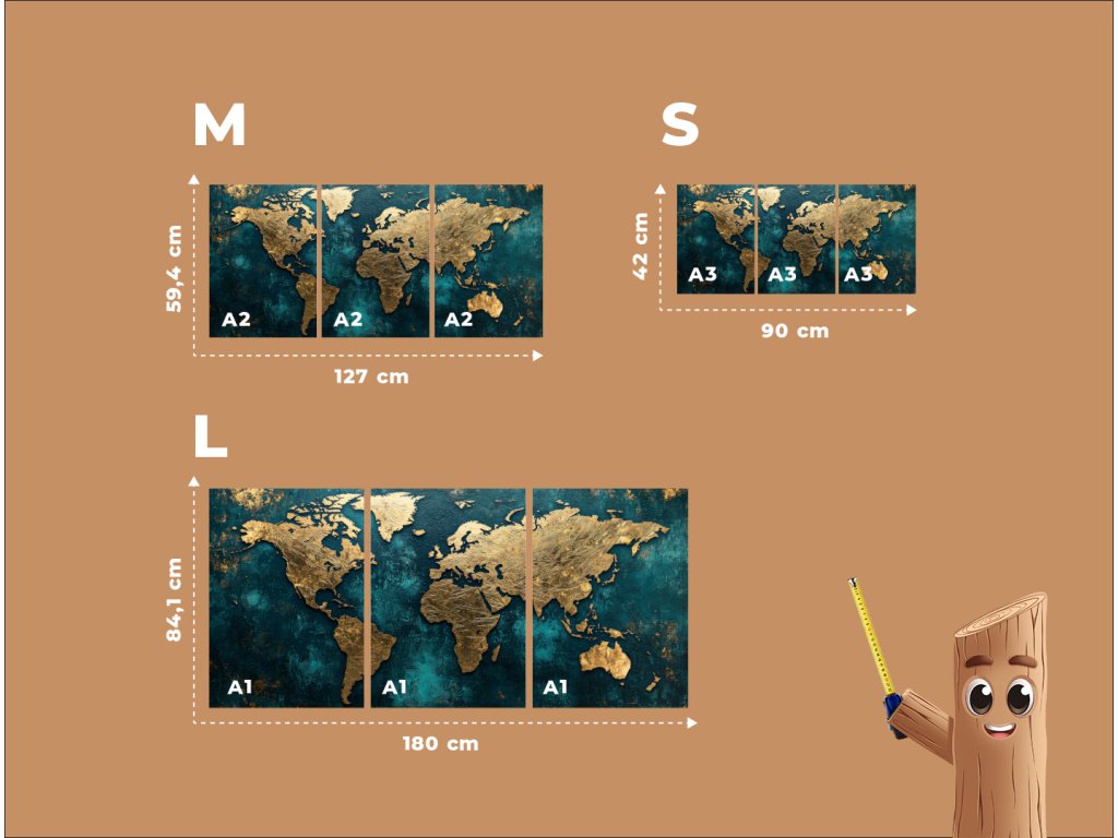 Tento dekorativní třídílný nástěnný obraz s motivem mapy světa kombinuje luxusní zlaté tóny s výraznou tyrkysovou barvou. Kontrastní barvy vytvářejí moderní a elegantní vzhled s nádechem exkluzivity. Díky UV tisku je obraz vhodný do moderních interiérů, kanceláří nebo reprezentativních prostor, kde může sloužit jako dominantní designový prvek.