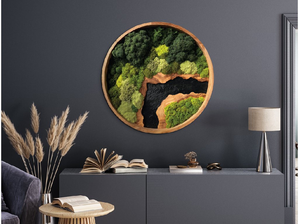 Kulatý mechový obraz Zelený nádech přinese do vašeho interiéru dokonalou imitaci živého mechu. Díky moderní UV technologii získáte realistický 3D efekt bez potřeby péče. Tento obraz si zachová svěží vzhled po celá léta a stojí méně než klasická mechová díla. Vyberte si originální kousek, který spojuje krásu přírody s praktičností.