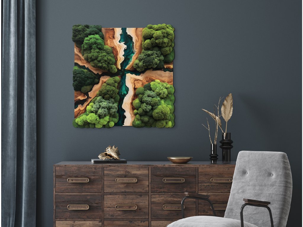 Vychutnejte si pohled na mechový obraz Smaragdový tok (UV tisk), který působí jako živý, ale bez nutnosti polévání či světla. Realistická imitace mechu i poutavého epoxidu je nejen cenově dostupnější, ale také trvalejší než originál. Váš prostor získá stylový designový prvek s dlouhou životností a nulovou údržbou. Tento obraz je ideálním řešením pro moderní domov nebo kancelář.