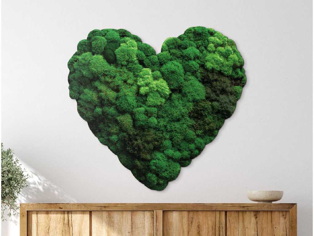 Srdcový Mechový obraz Nádechpřinese do vašeho interiéru dokonalou imitaci živého mechu. Díky moderní UV technologii získáte realistický 3D efekt bez potřeby péče. Tento obraz si zachová svěží vzhled po celá léta a stojí méně než klasická mechová díla. Vyberte si originální kousek, který spojuje krásu přírody s praktičností.