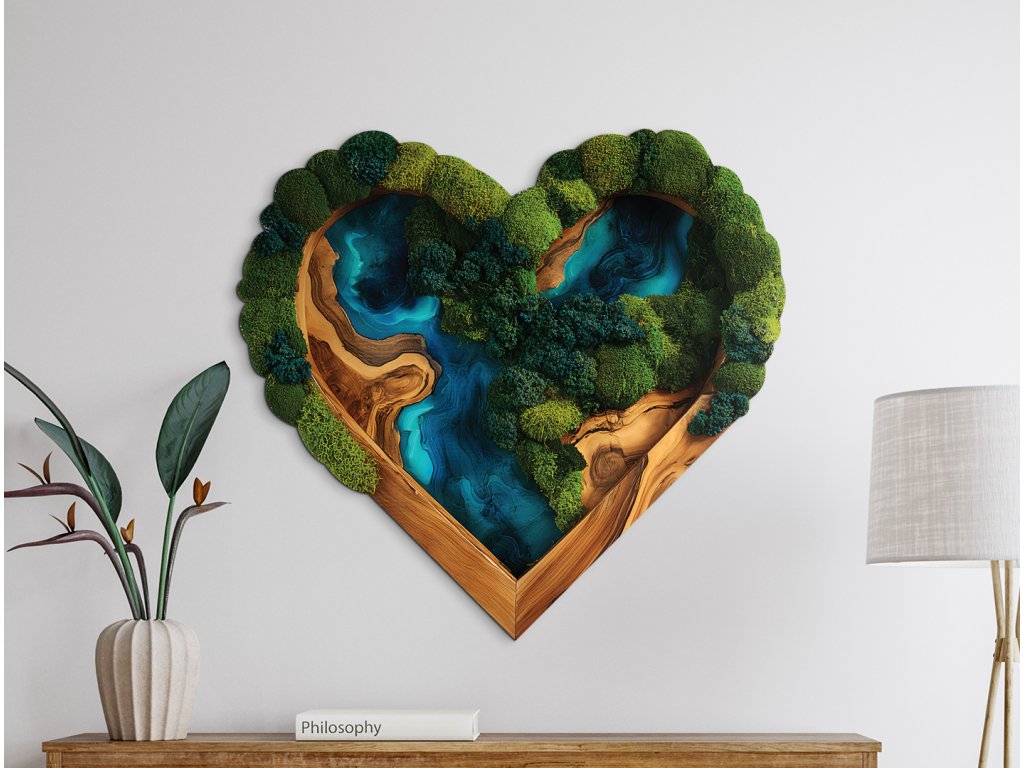 Dopřejte si srdcový mechový obraz Proudění (UV tisk), který působí jako živý, ale bez nutnosti polévání či světla. Realistická imitace mechu i poutavého epoxidu je nejen cenově dostupnější, ale také trvalejší než originál. Váš prostor získá stylový designový prvek s dlouhou životností a nulovou údržbou. Tento obraz je ideálním řešením pro moderní domov nebo kancelář.