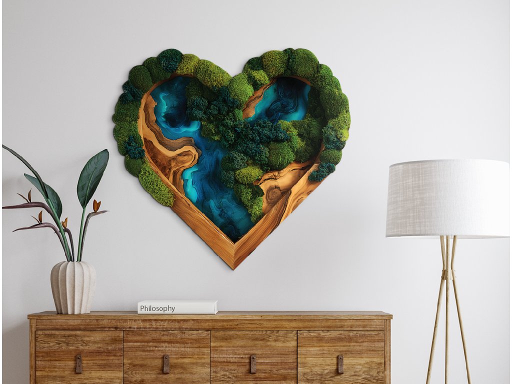 Dopřejte si srdcový mechový obraz Proudění (UV tisk), který působí jako živý, ale bez nutnosti polévání či světla. Realistická imitace mechu i poutavého epoxidu je nejen cenově dostupnější, ale také trvalejší než originál. Váš prostor získá stylový designový prvek s dlouhou životností a nulovou údržbou. Tento obraz je ideálním řešením pro moderní domov nebo kancelář.