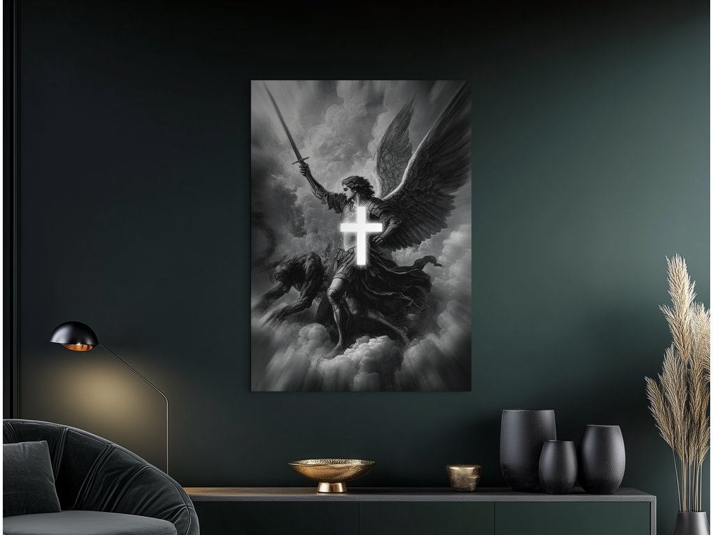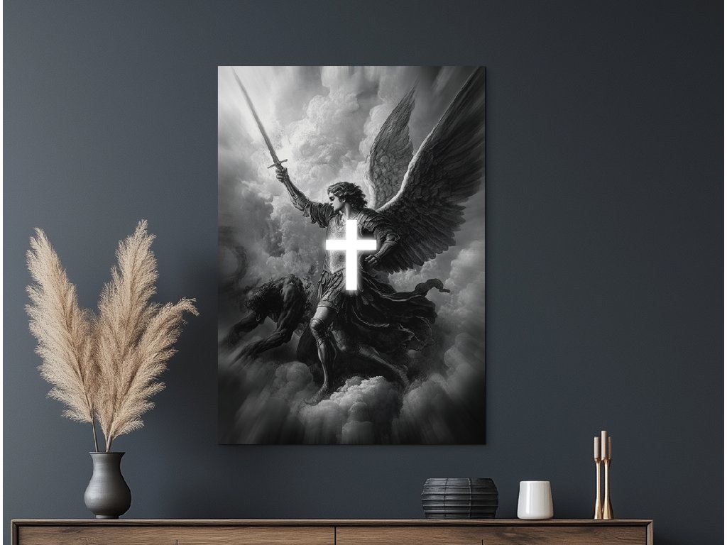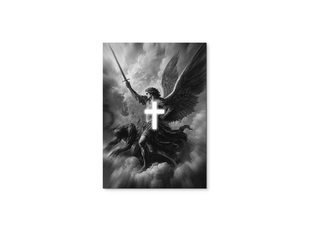 Obraz zobrazuje archanděla Michala, legendárního nebeského bojovníka, jak stojí odhodlaně s mečem, připravený porazit zlo. Jeho postoj, svatozáře a výrazná zbroj zosobňují ochranu, spravedlnost a boží moc. Symbol vítězství světla nad temnotou, Michal je patronem bojovníků a štítem víry.