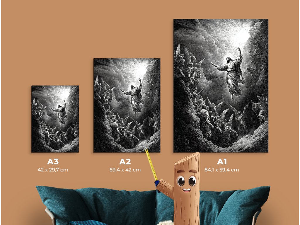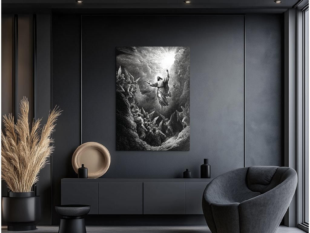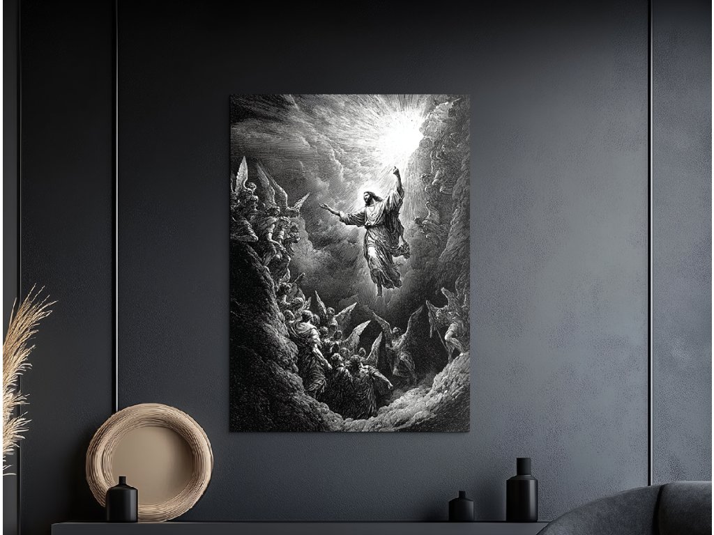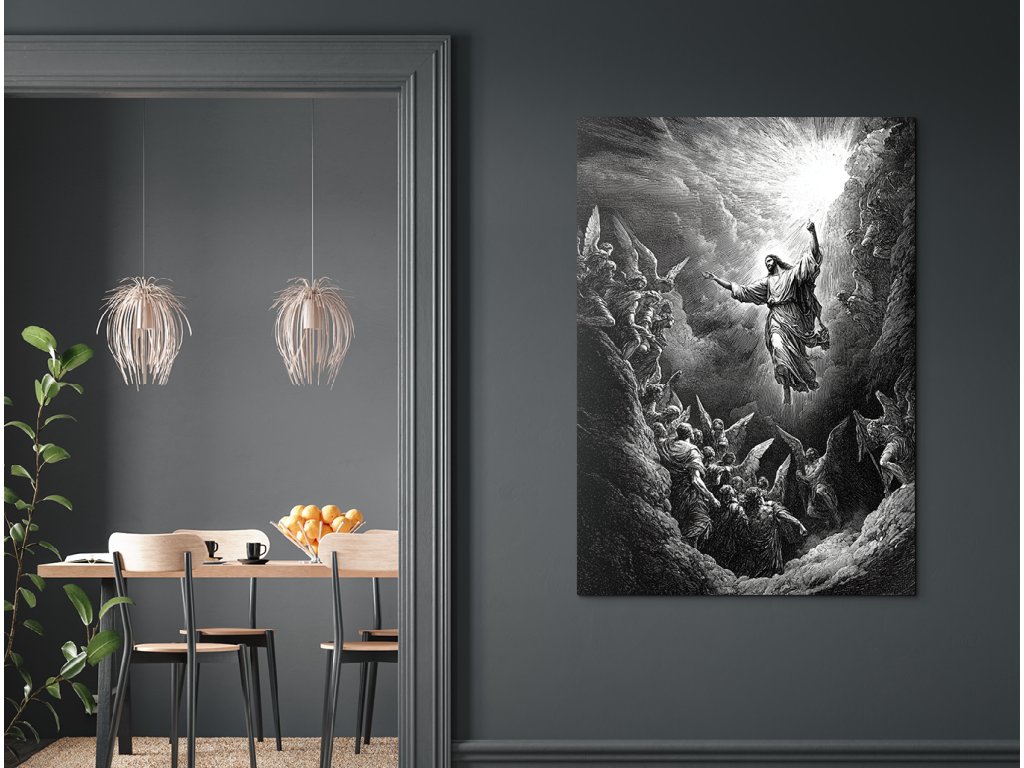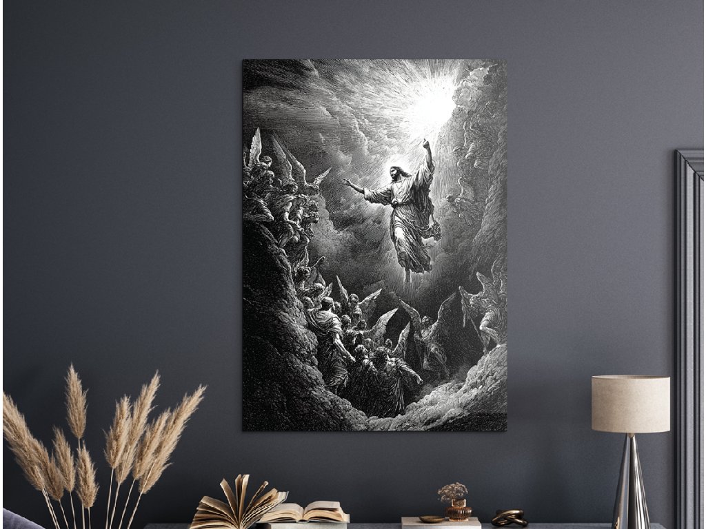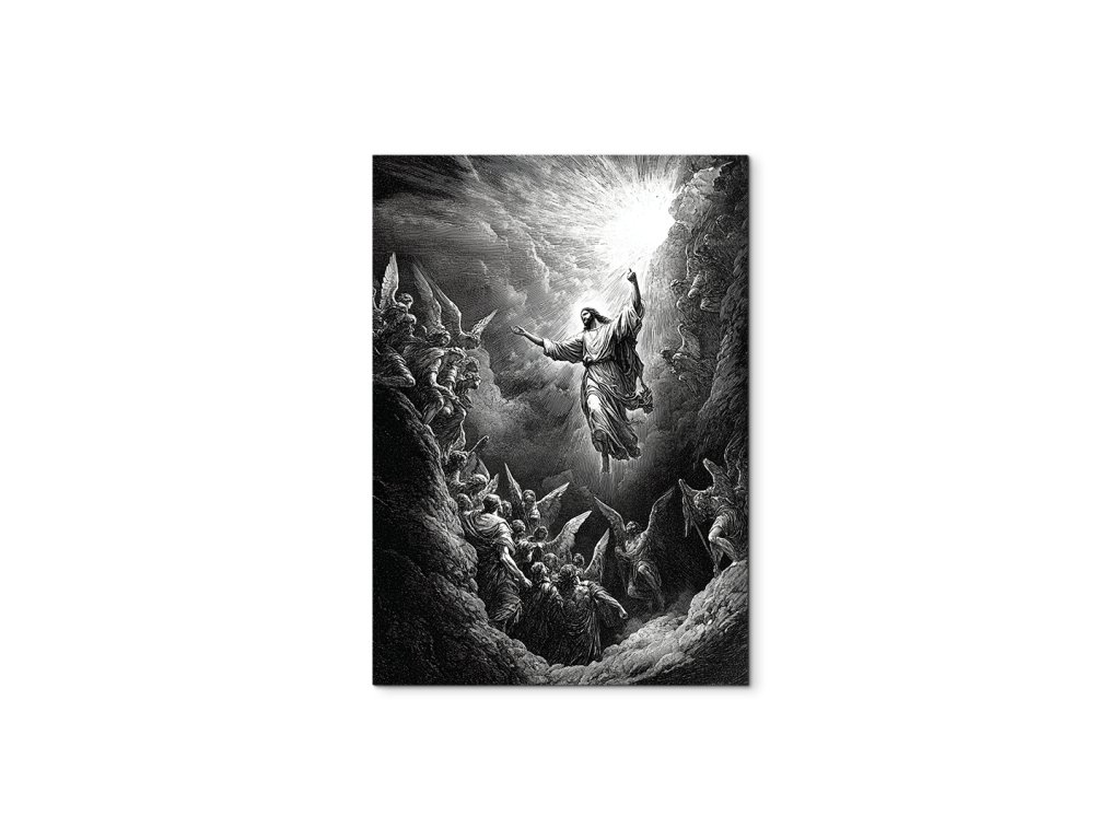 Obraz zachycuje moment, kdy Ježíš vystupuje do nebe, obklopený světlem, které kontrastuje s tmavším pozadím. V černobílém provedení vyniká symbolika světla a stínu, čímž dílo působí nadčasově, klidně a duchovně.