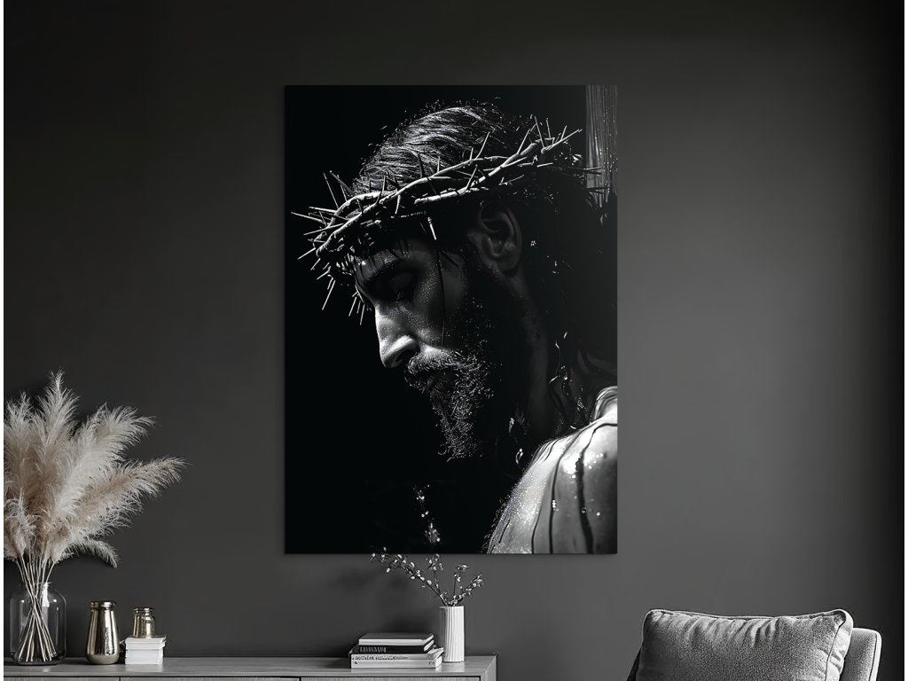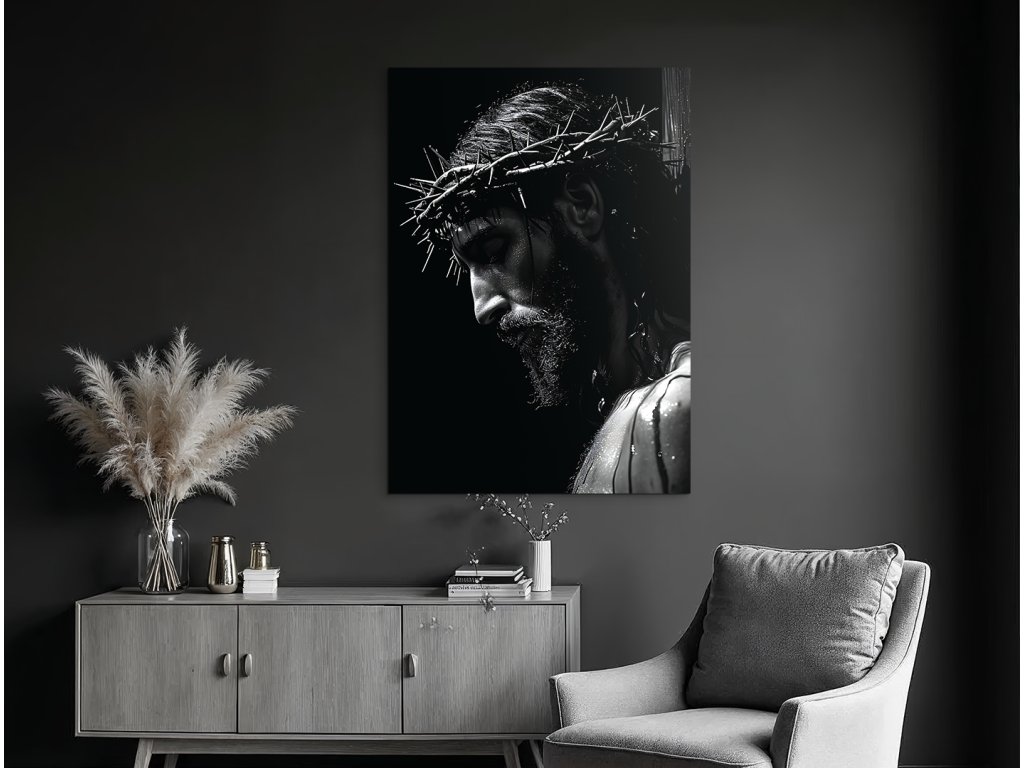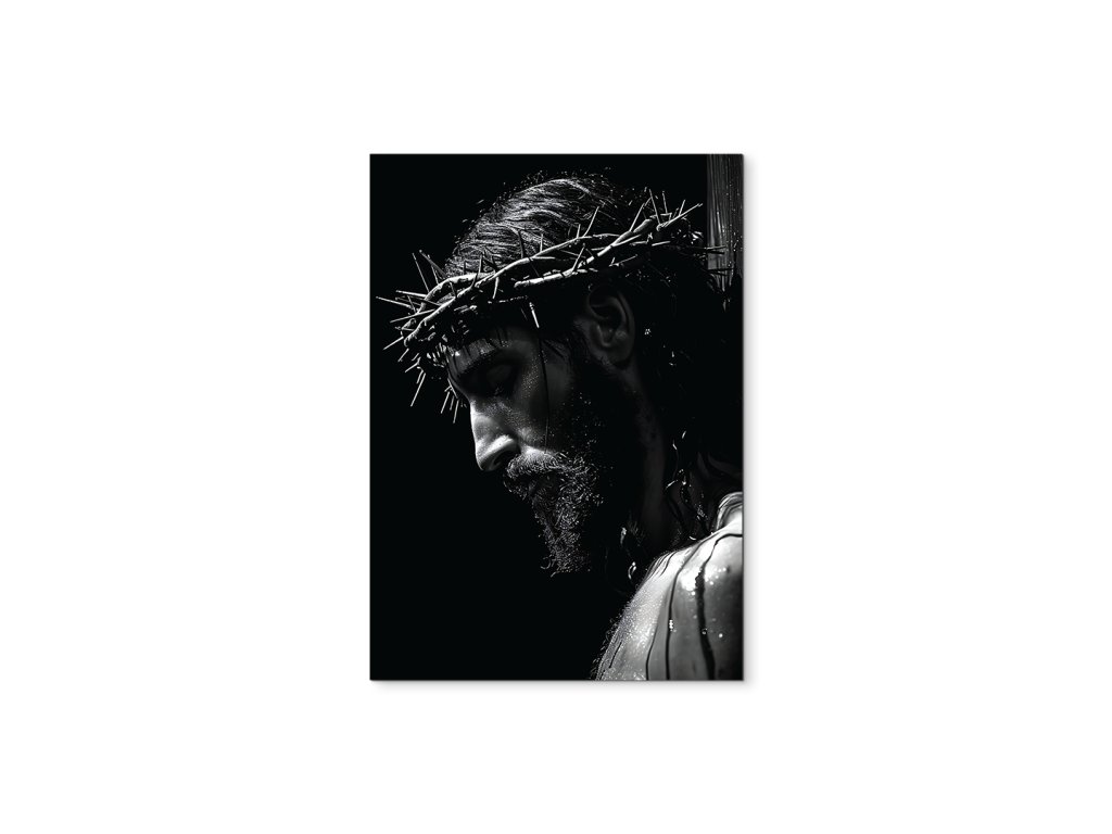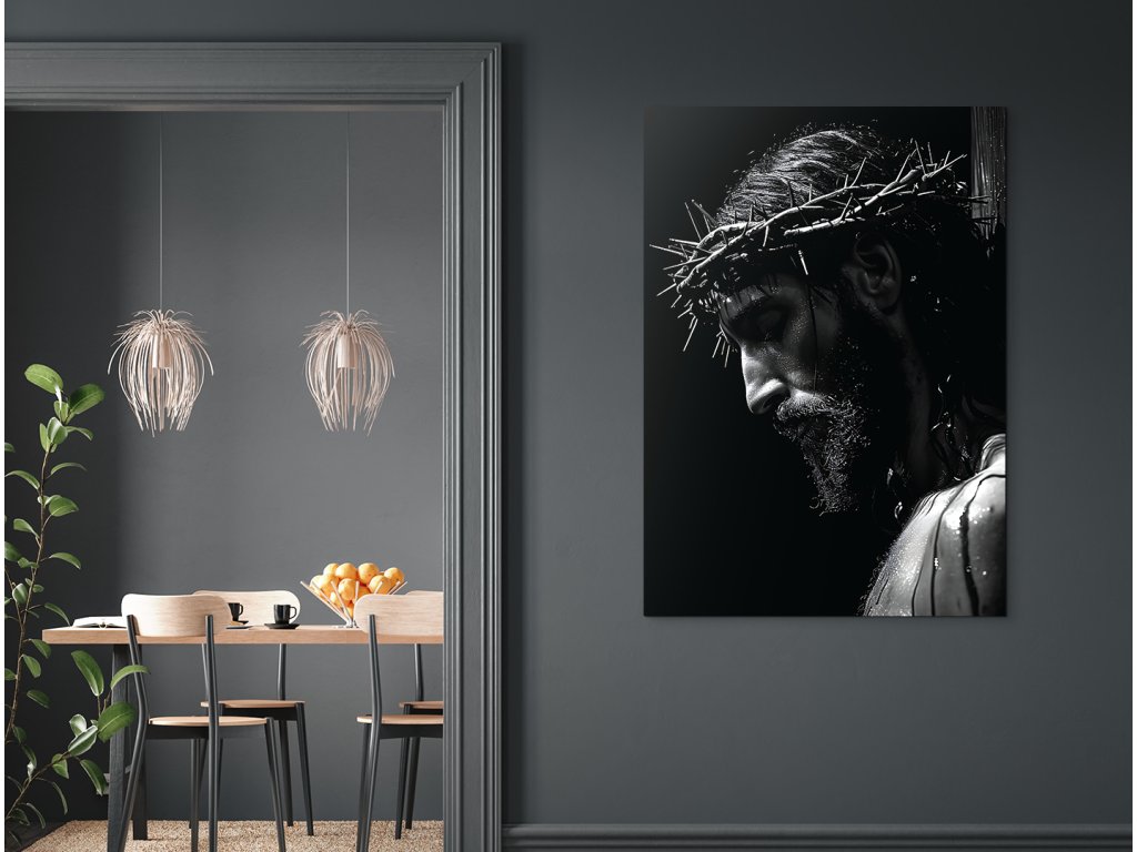 Černobílý obraz zachycuje tvář Ježíše Krista s trnovou korunou, ponořeného do hlubokého utrpení a ticha. Minimalistické provedení v odstínech černé, šedé a bílé umocňuje emocionální sílu výrazu, který je plný bolesti, pokory a oběti. Toto dílo působí nadčasově a kontemplativně, zve k zastavení a soucitu.
