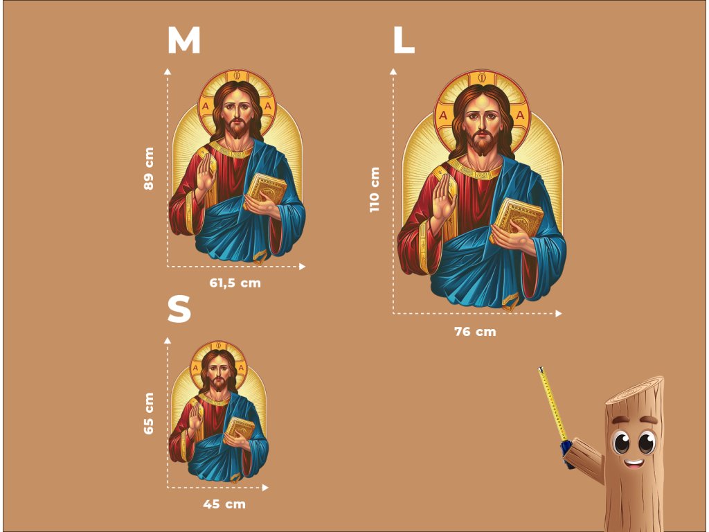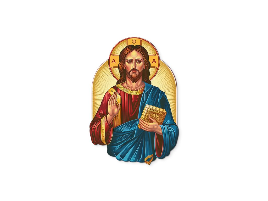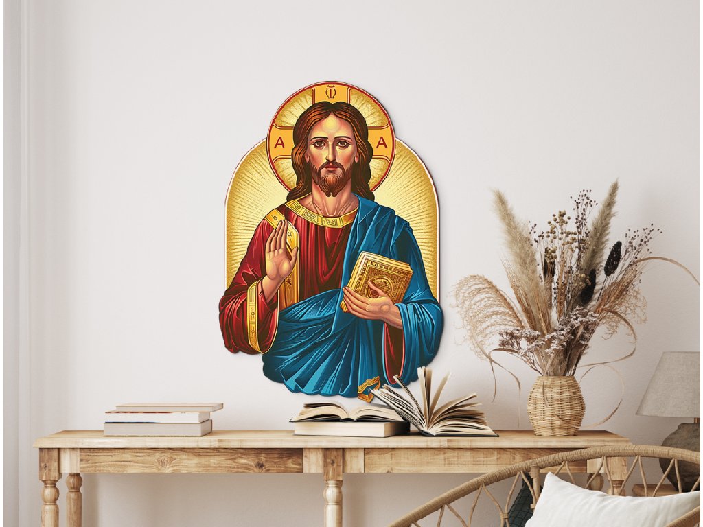 Obraz zobrazuje Ježíše Krista v ikonickém stylu, charakteristickém pro křesťanskou sakrální tradici. Tvář Krista je zobrazena s klidem a důstojností, často se svatozáří a symbolickými znaky, které vyjadřují jeho božskou přirozenost a poslání. Ikonografický styl zdůrazňuje nadčasovost a duchovní hloubku – jako vizuální vyjádření víry, naděje a Boží přítomnosti.
