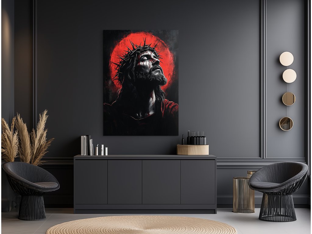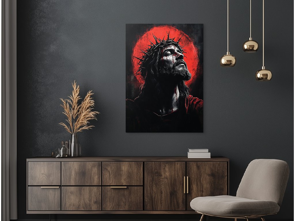 Tento obraz zobrazuje tvář Ježíše Krista v okamžiku hlubokého utrpení, s trnovou korunou pevně vtlačenou do jeho čela. Jeho pohled je sklonený, plný bolesti a soucitu, čímž vyjadřuje tichou, ale nekonečnou lásku k lidstvu. Kontrasty stínů, barev a světla na tváři zdůrazňují duchovní hloubku oběti a sílu vykupitelské lásky.