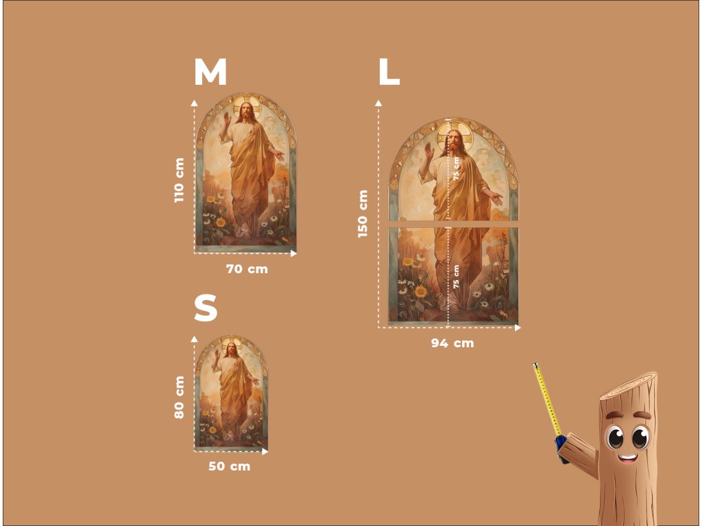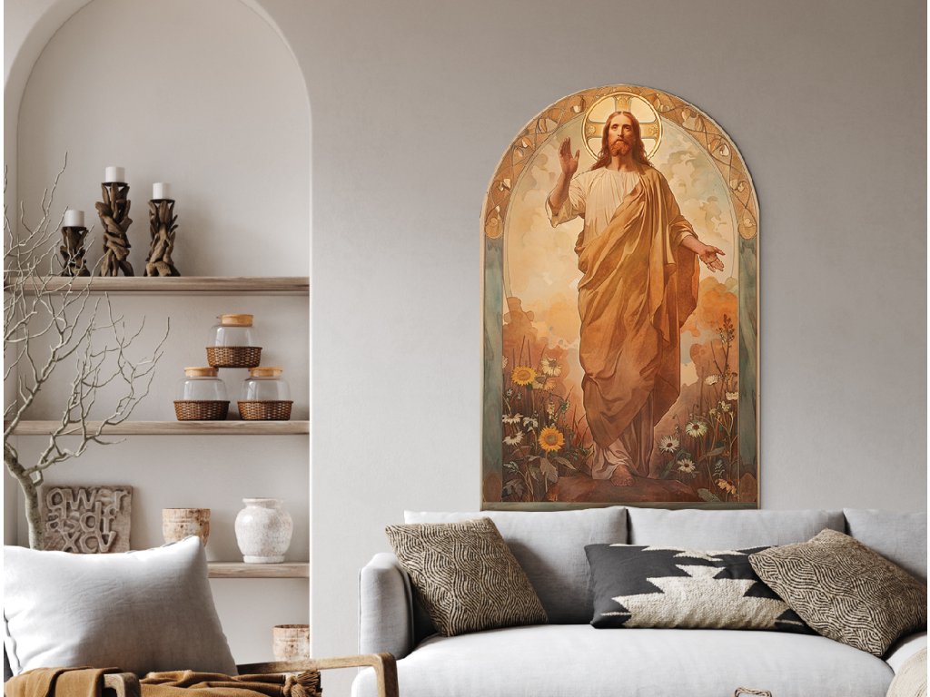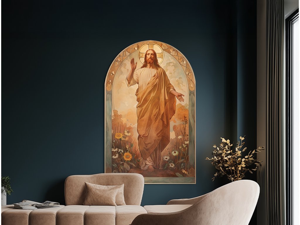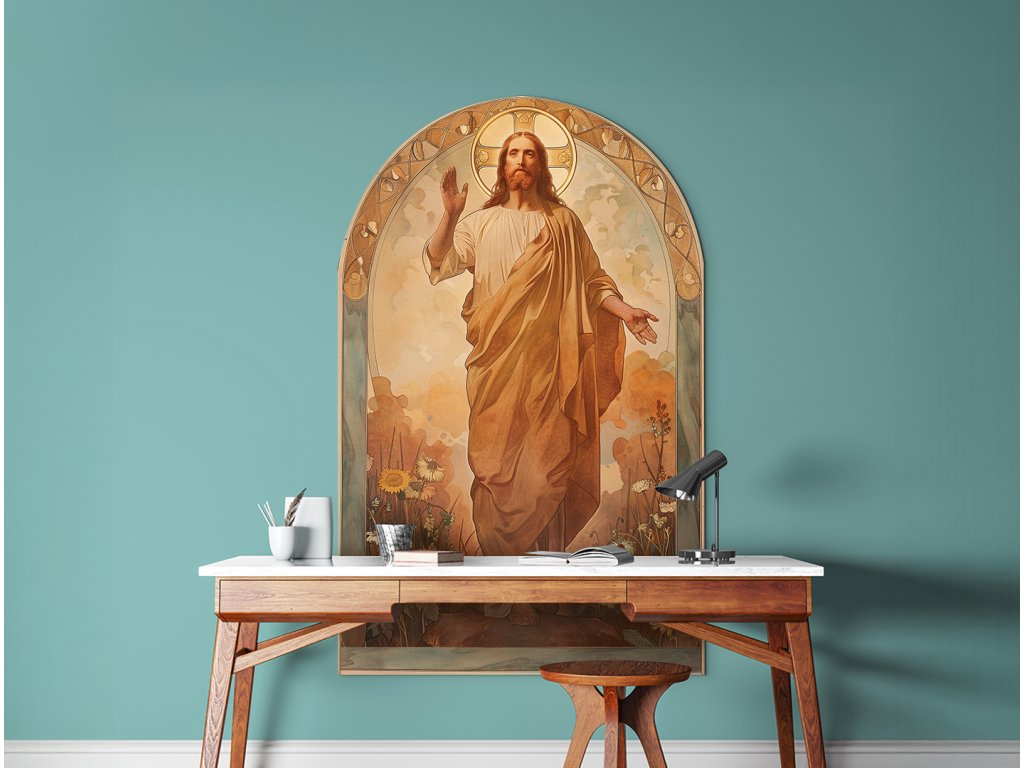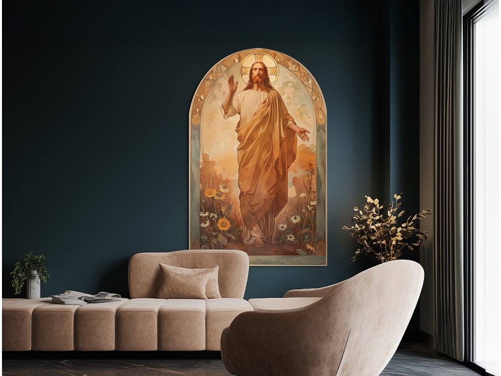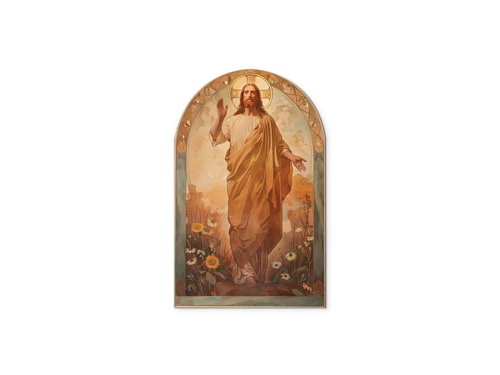 Umělecké zobrazení Ježíše Krista v celé postavě zachycuje jeho postoj lásky, přijetí a požehnání. Jedna ruka je zvednutá v gestu klidu, druhá otevřená – jako pozvání k víře a důvěře. Kristus je obklopen aureolou s křížem, která vyjadřuje jeho božskou podstatu, zatímco květiny a rostliny kolem něj symbolizují život, naději a duchovní obnovu. Obloukový tvar a dekorativní detaily nesou prvky secese nebo art deco, čímž dílo propojuje klasické poselství s jemným uměleckým stylem.
