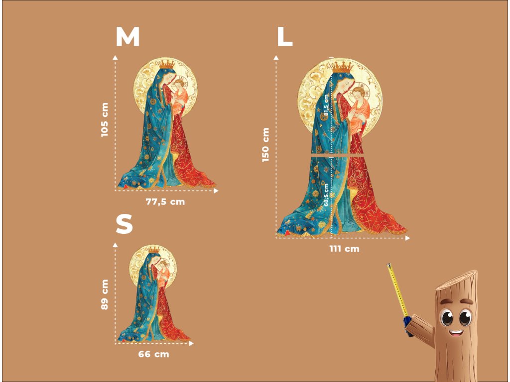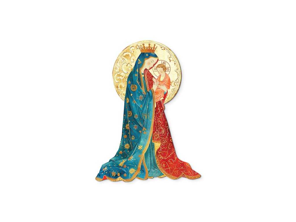 Maria je vyobrazena jako laskavá matka, která ochraňuje svého syna, zatímco Ježíšek představuje příchod Spasitele na svět.Zlaté svatozáře kolem jejich hlav zdůrazňují jejich svatost a duchovní spojení, které přesahuje lid. Tento výjev je ztělesněním mateřské lásky, oddanosti a víry.