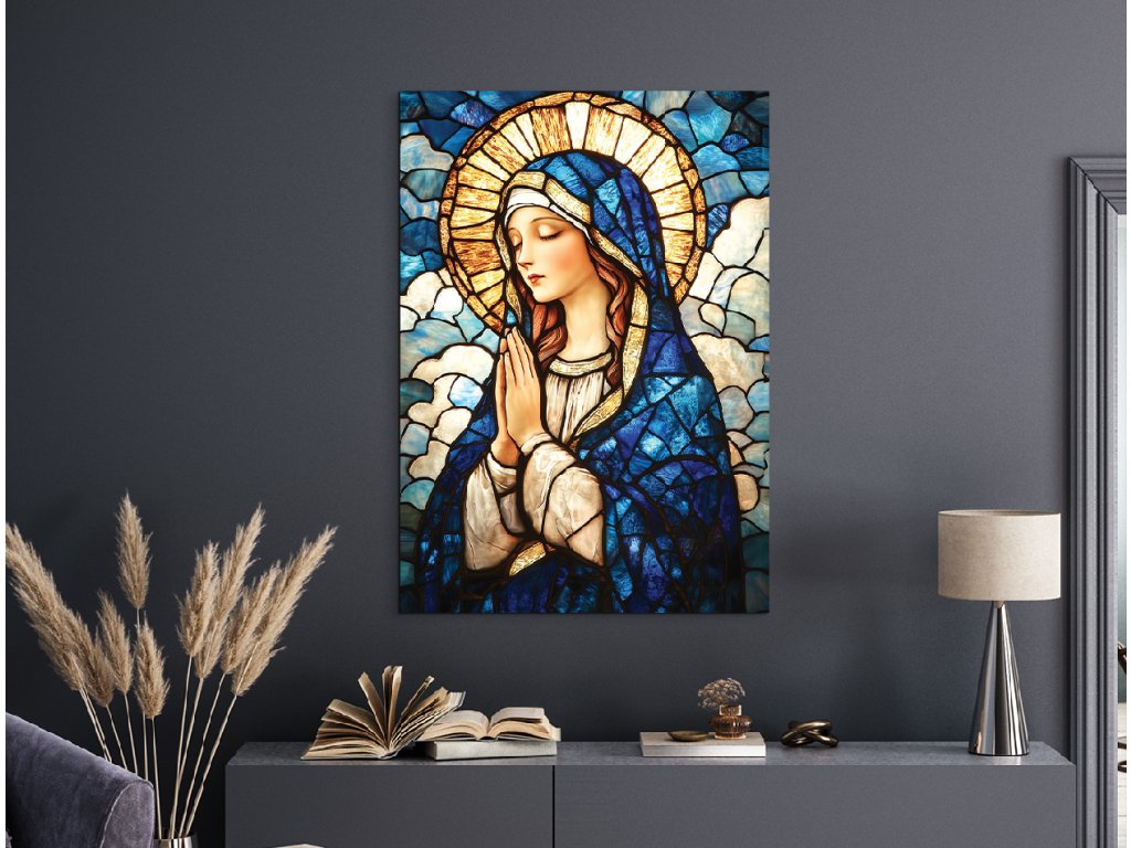 Obraz zobrazuje Pannu Marii v ikonickém modrém plášti se zlatou svatozáří, vyobrazenou ve stylu mozaiky. Detaily vytvořené z barevných úlomků vytvářejí posvátnou atmosféru a zvýrazňují její klidnou a ochrannou přítomnost.